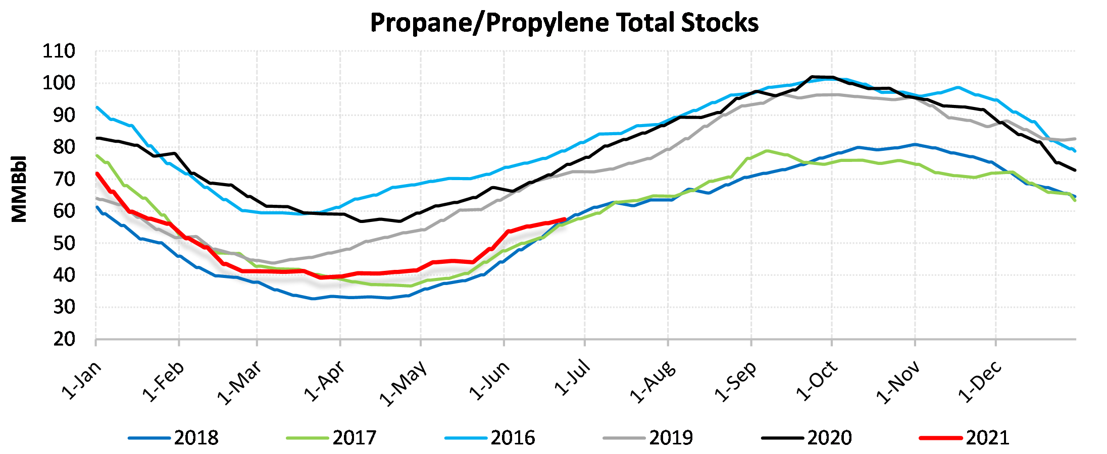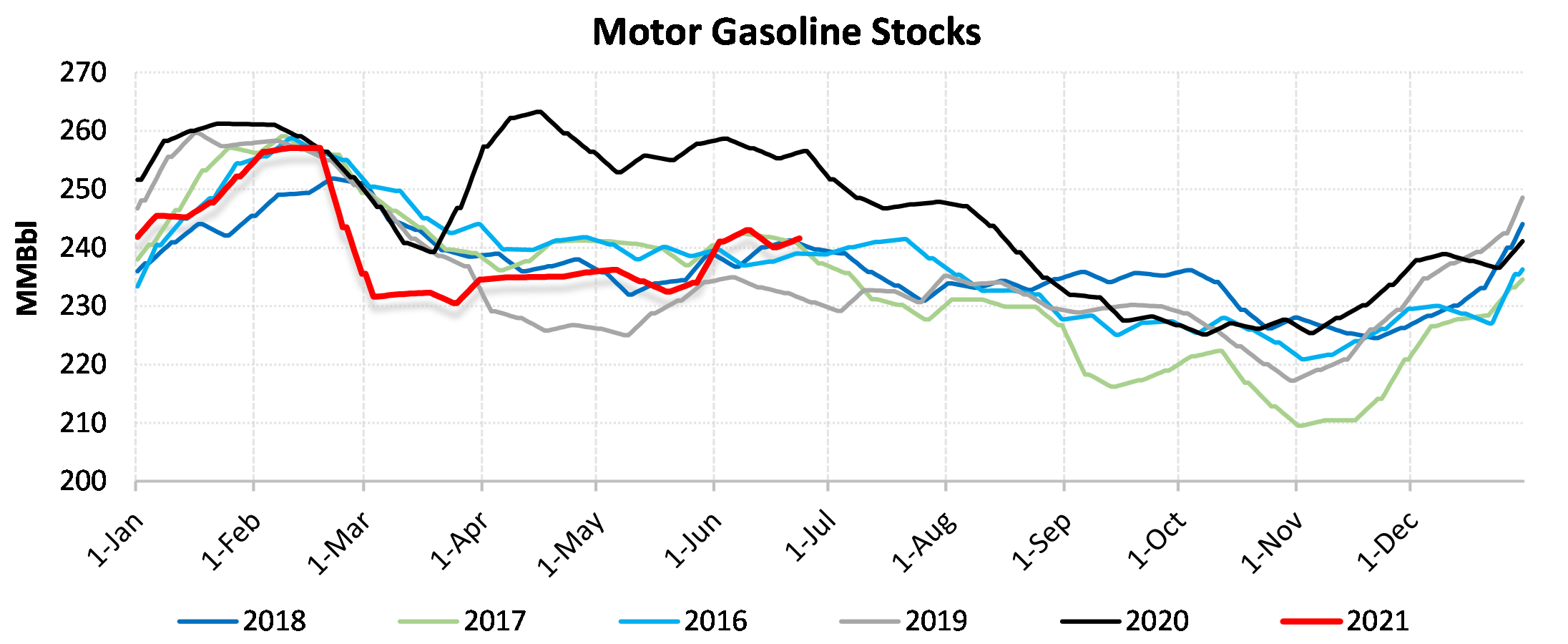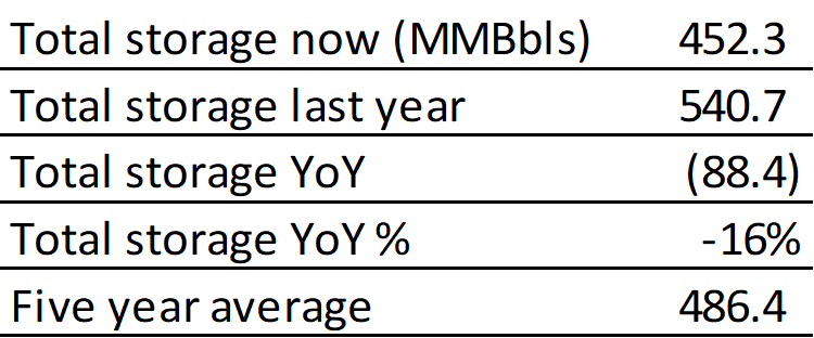 Inventories for the US are now at a deficit of 88.38 MBbls to last year and a deficit of 34.08 MBbls to the five-year average.