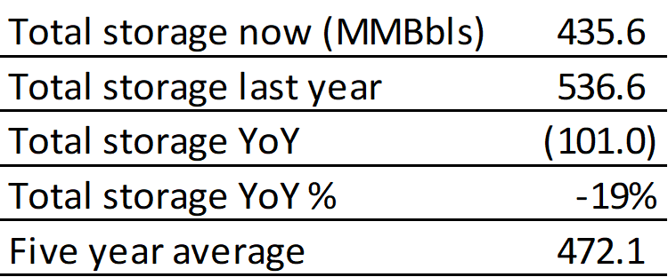 Inventories for the US are now at a deficit of 100.982 MBbls to last year and a deficit of 36.50 MBbls to the five-year average.