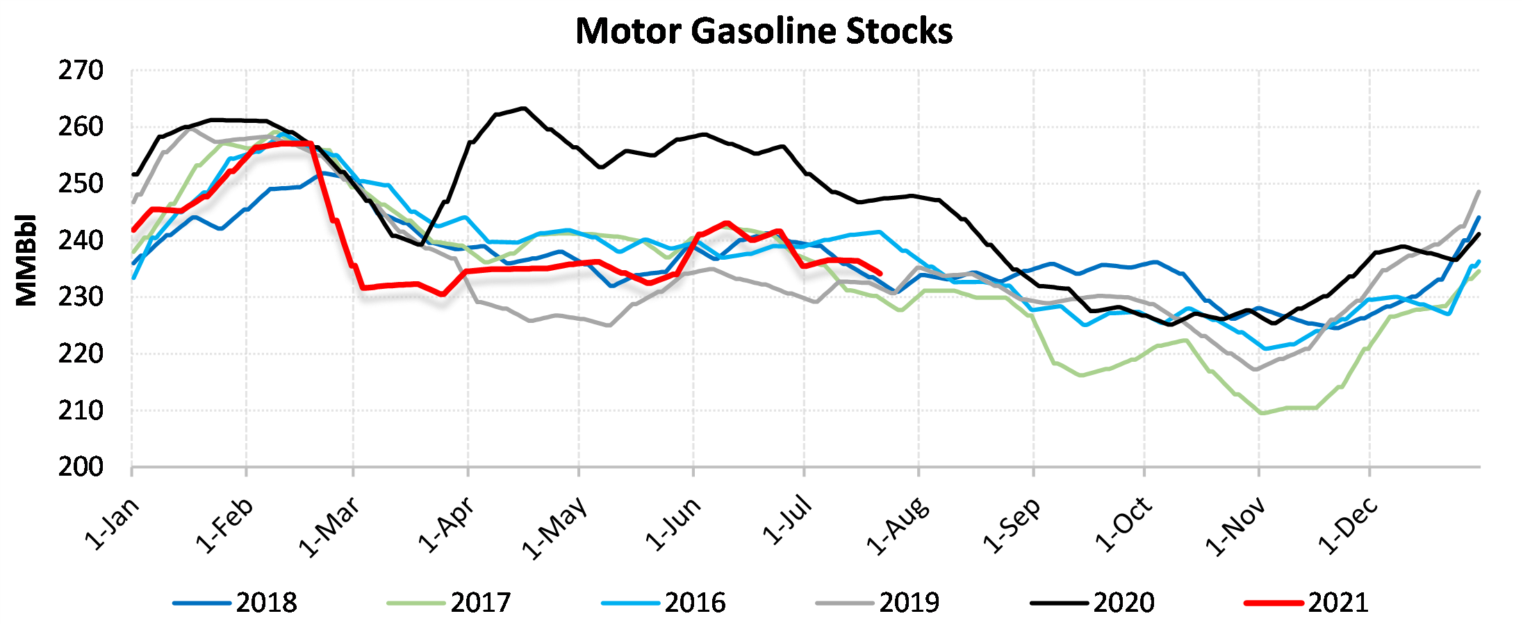 EIA reported a draw of -4089 MBbls in U.S. crude-oil inventories for the week ending 7/23/2021. This was larger than the average estimate of -2407 MBbls as reported by Bloomberg.