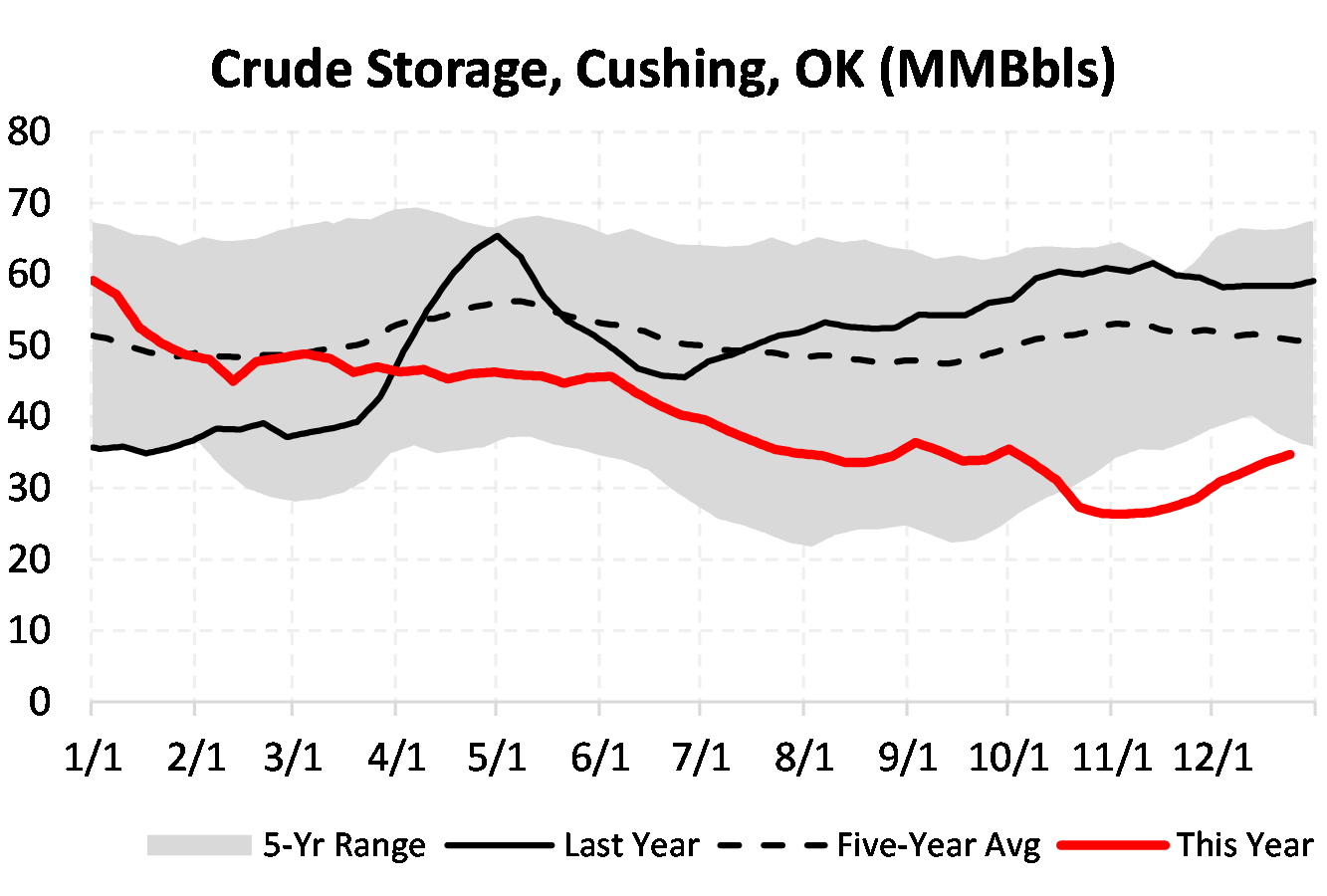 Inventories for the US are now at a deficit of 79.539 MBbls to last year and a deficit of 40.05 MBbls to the five-year average.