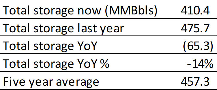 Inventories for the US are now at a deficit of 65.272 MBbls to last year and a deficit of 46.96 MBbls to the five-year average.
