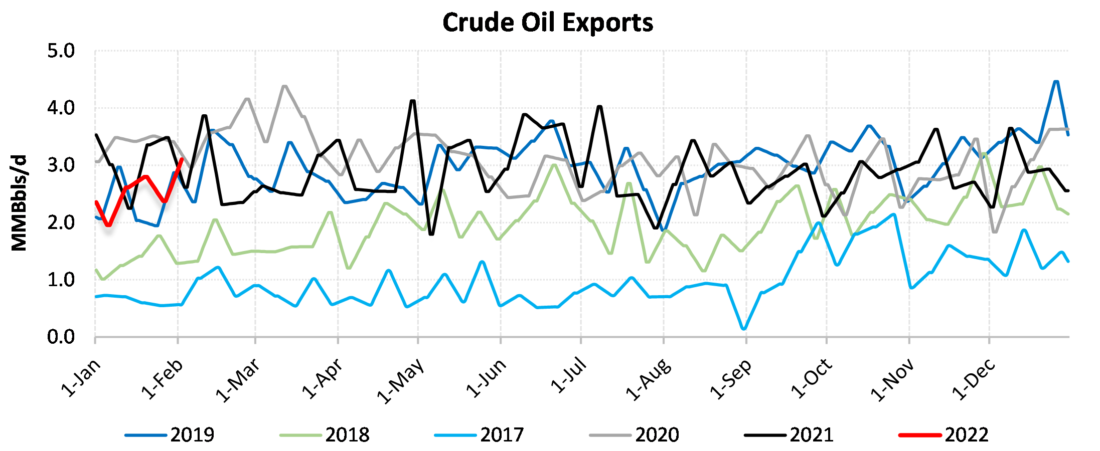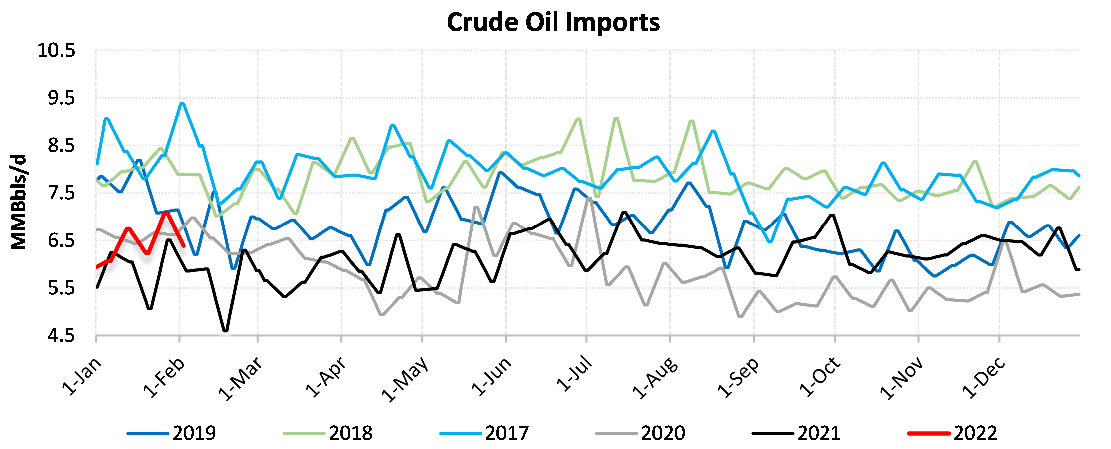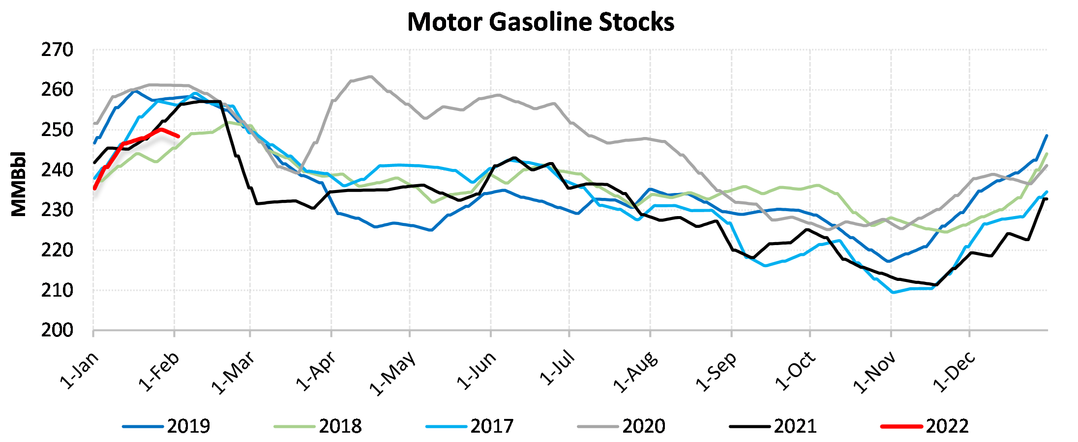 EIA reported a draw of -4,756 MBbls in U.S. crude-oil inventories for the week ending 2/4/2022. This was larger than the average estimate of 1,272 MBbls as reported by Bloomberg.