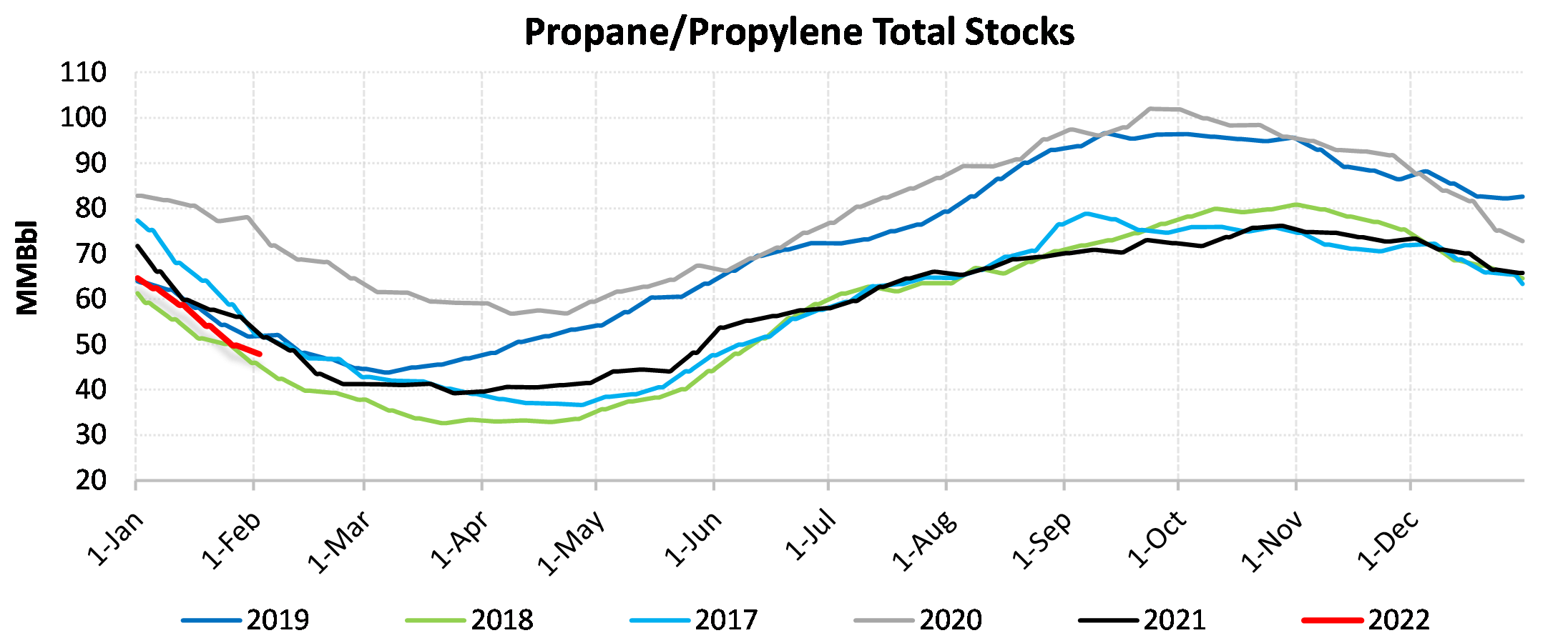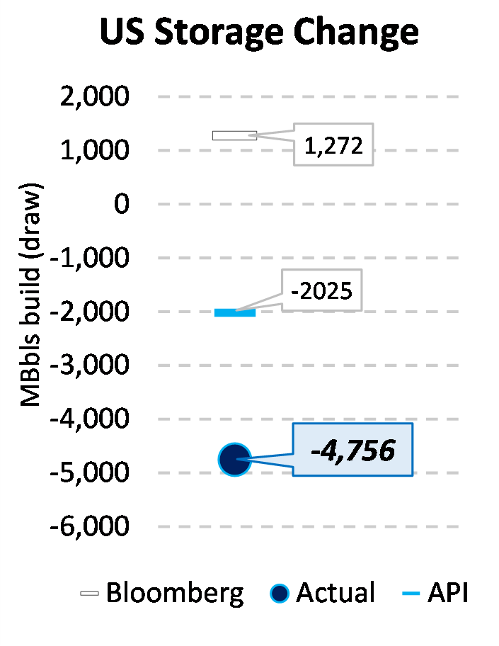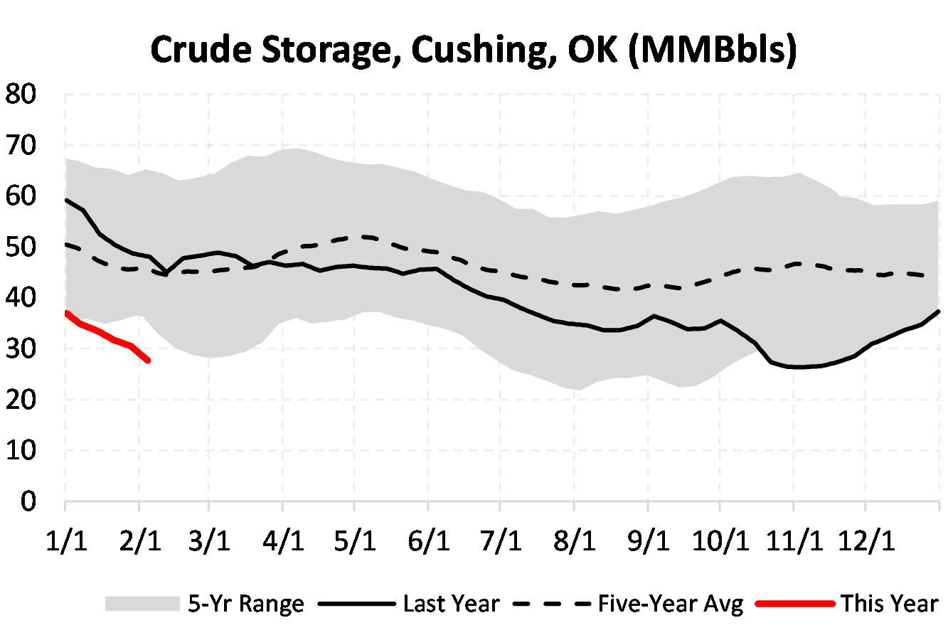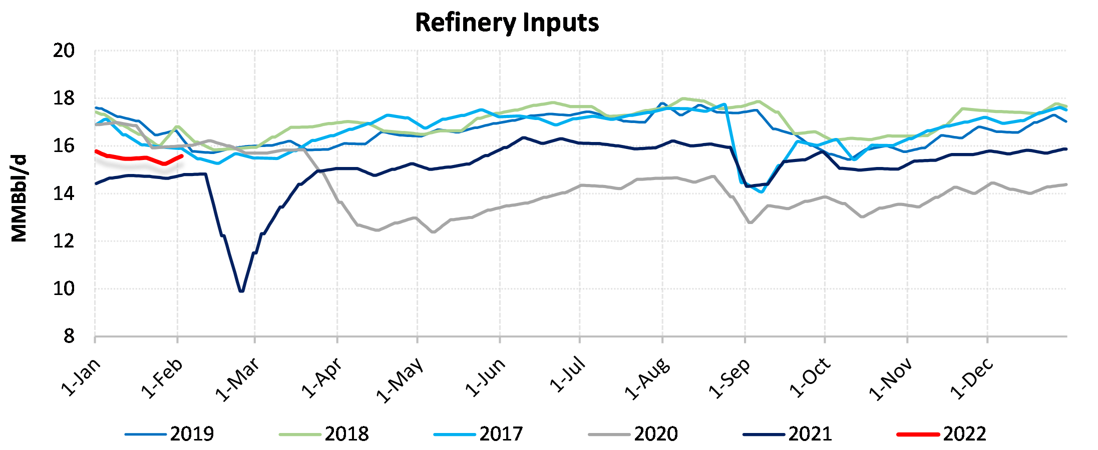 EIA reported a draw of -4,756 MBbls in U.S. crude-oil inventories for the week ending 2/4/2022. This was larger than the average estimate of 1,272 MBbls as reported by Bloomberg.