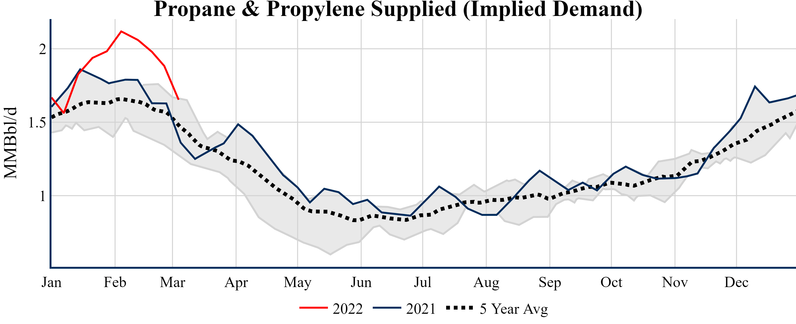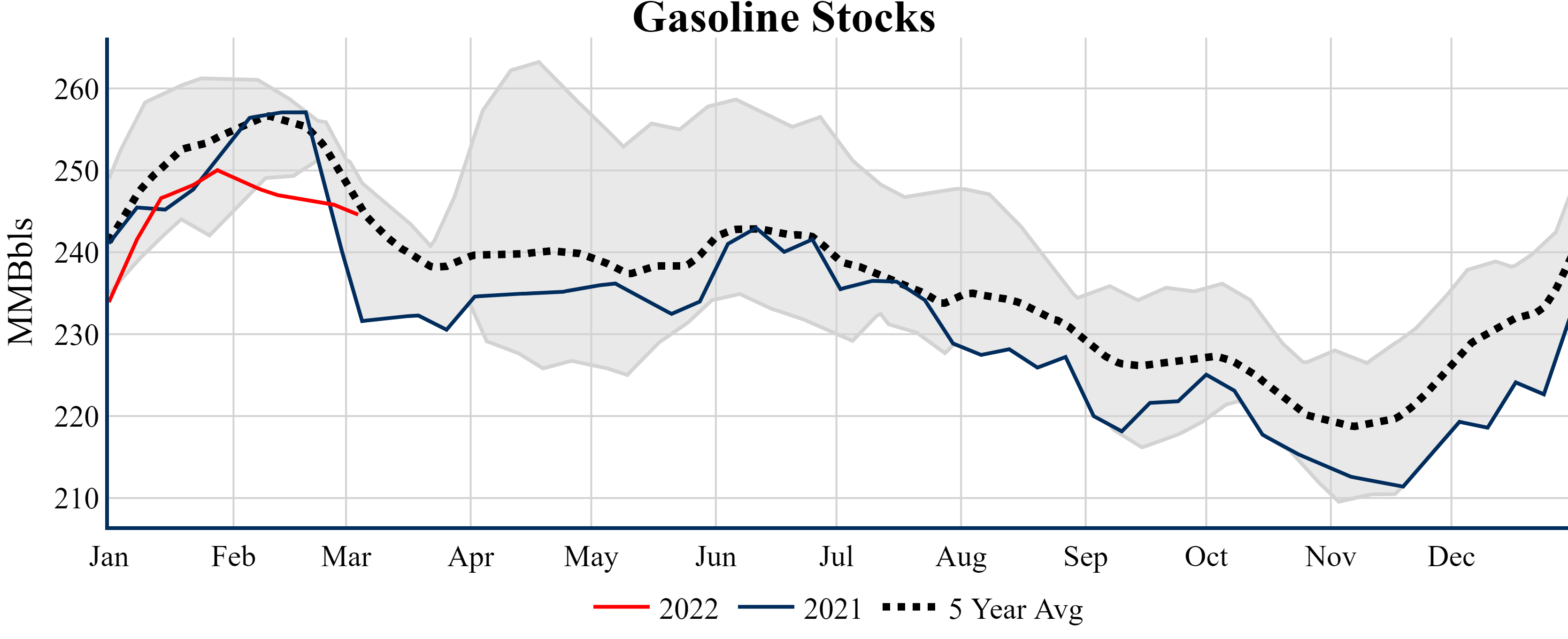 Inventories for the U.S. are now at a deficit of 84.90 MMBbls (-17.1%) to last year, and a deficit of 58.80 MMBbls (-12.5%) to the five-year average.