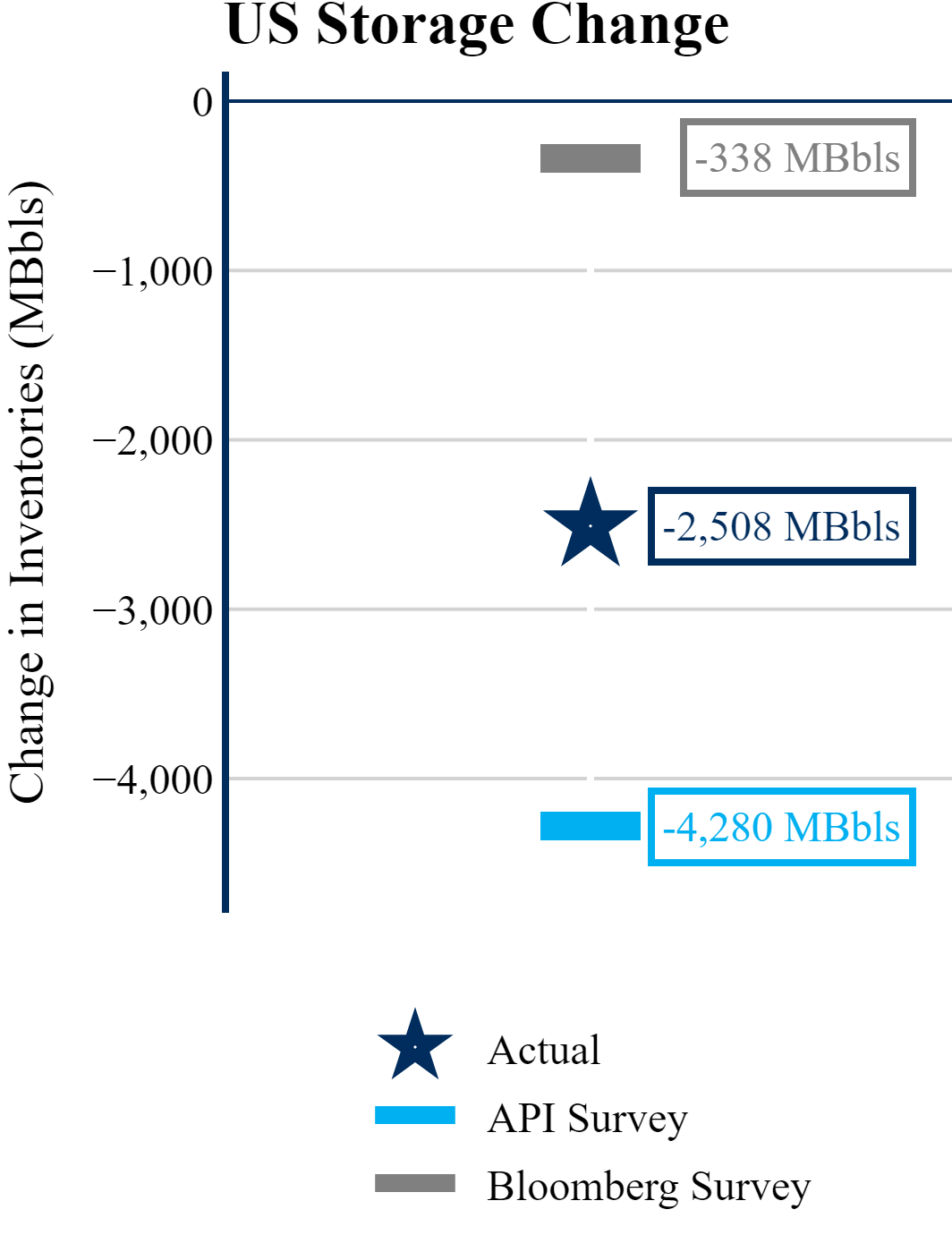 The EIA reported a draw of -2,508 MBbls in U.S. crude-oil inventories. This draw was larger than the average estimate of -337 MBbls as reported by Bloomberg.