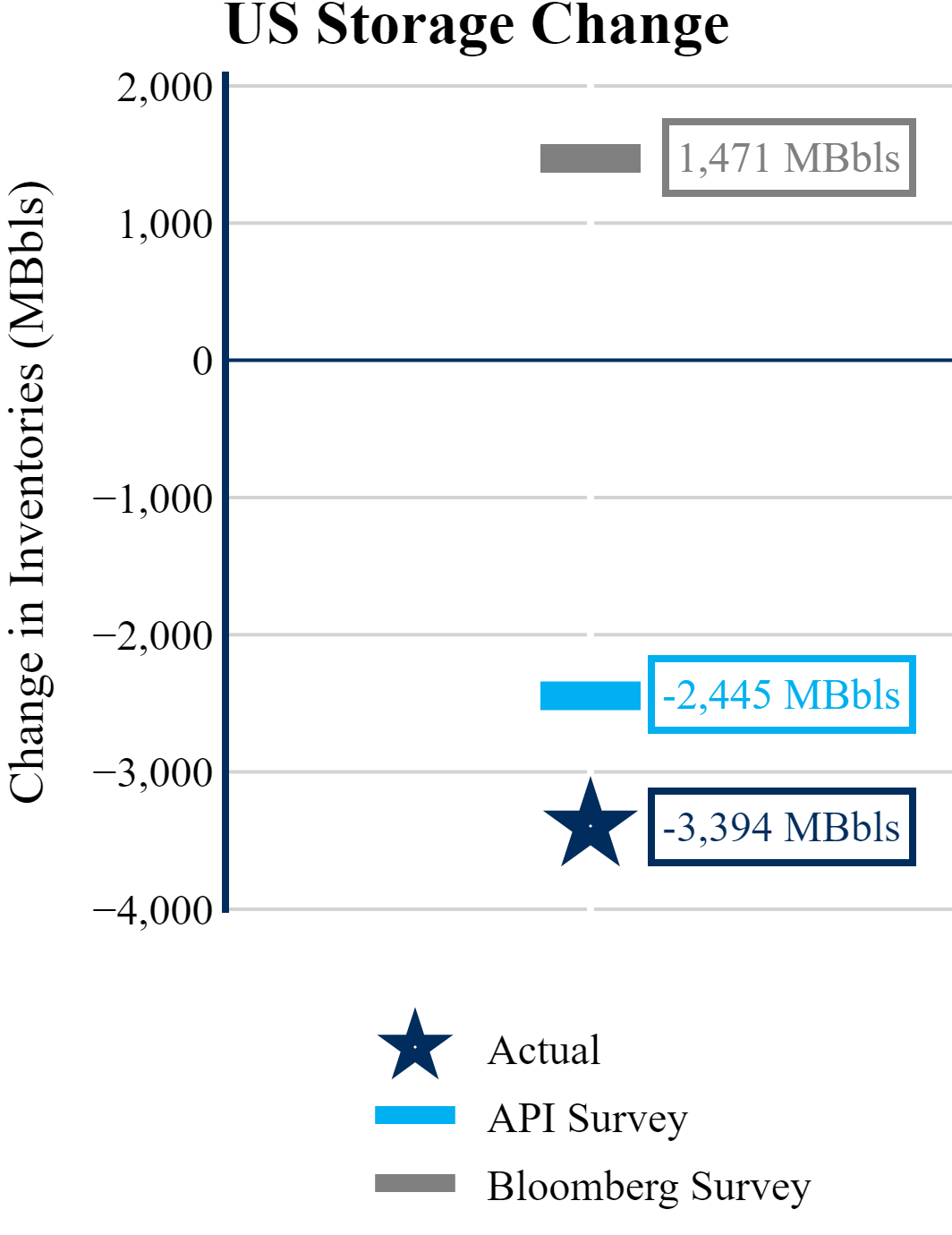 The EIA reported a draw of -3,394 MBbls in U.S. crude-oil inventories. In contrast, the market expected a build of +1,471 MBbls as reported by Bloomberg.