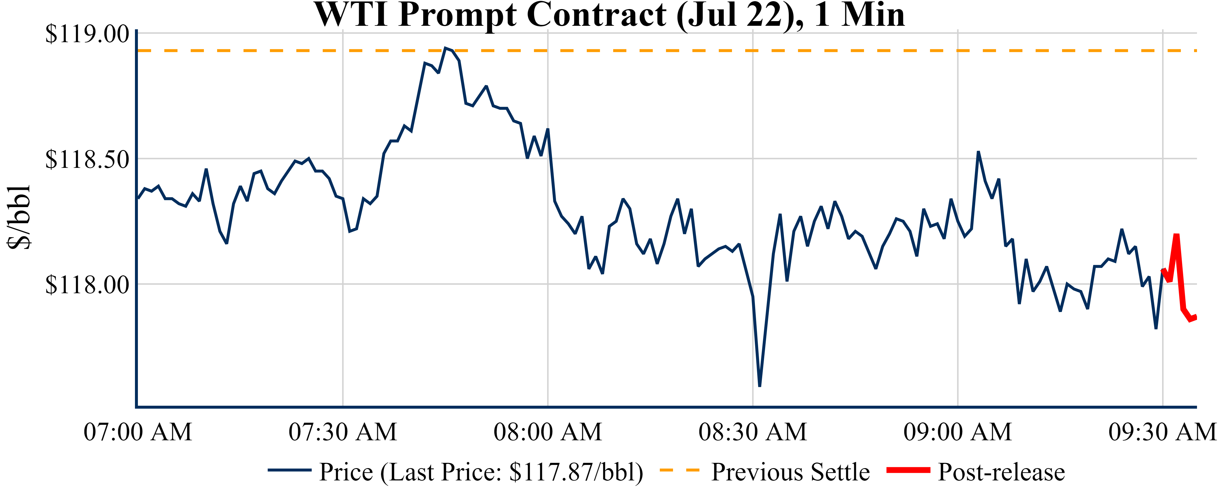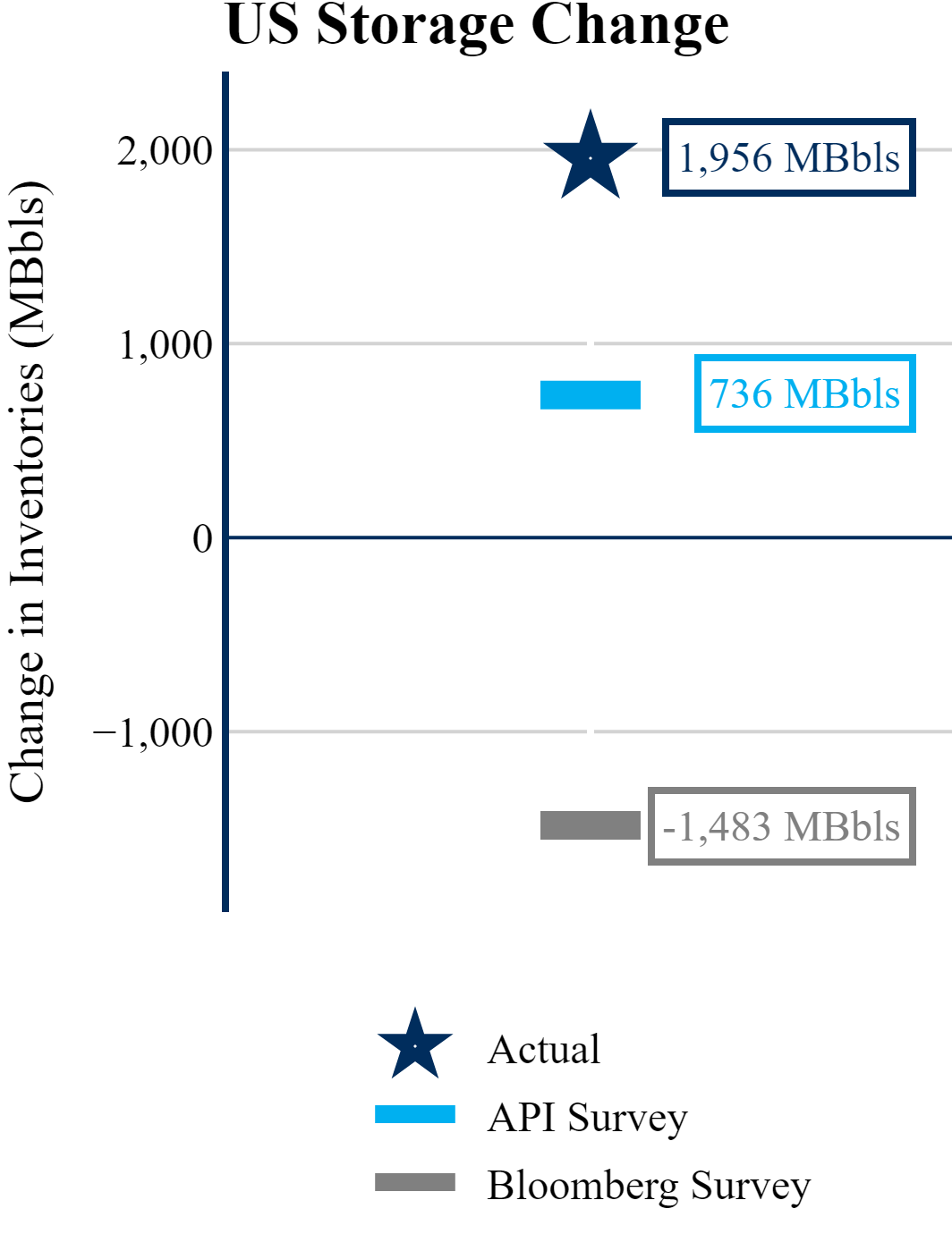 The EIA reported a build of +1,956 MBbls in U.S. crude-oil inventories. In contrast, the market expected a draw of -1,483 MBbls as reported by Bloomberg.