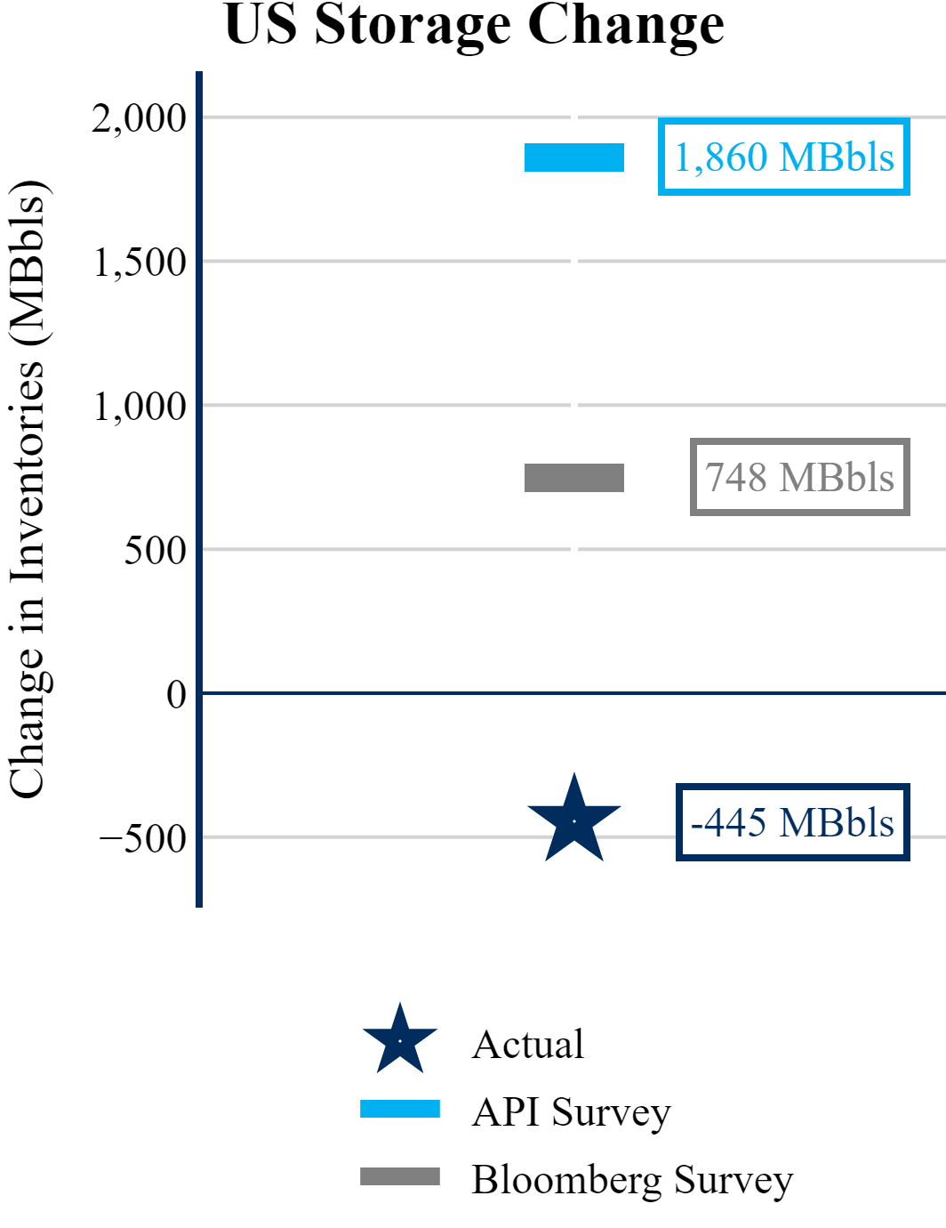 The EIA reported a draw of -445 MBbls in U.S. crude-oil inventories. In contrast, the market expected a build of +748 MBbls as reported by Bloomberg.