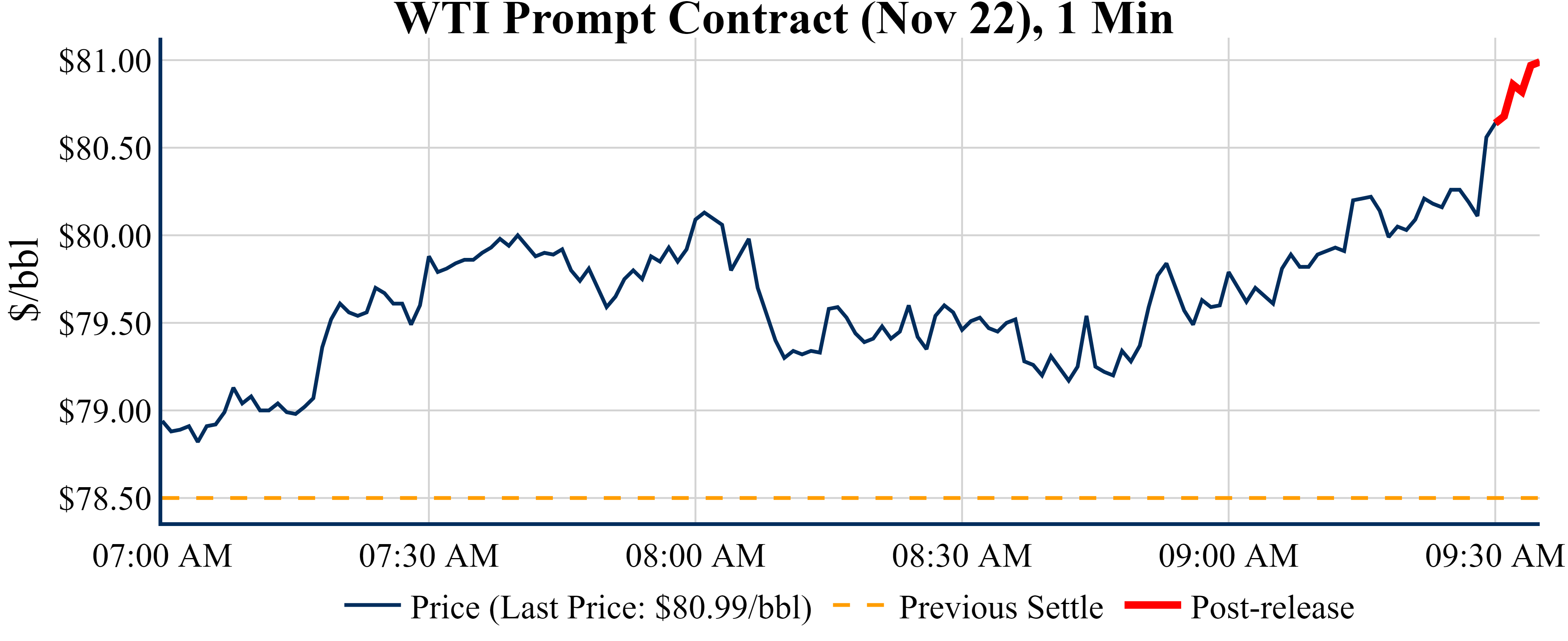 Prices were up in the five minutes following the announcement, to $80.99 from $80.64 just before 09:30 AM.