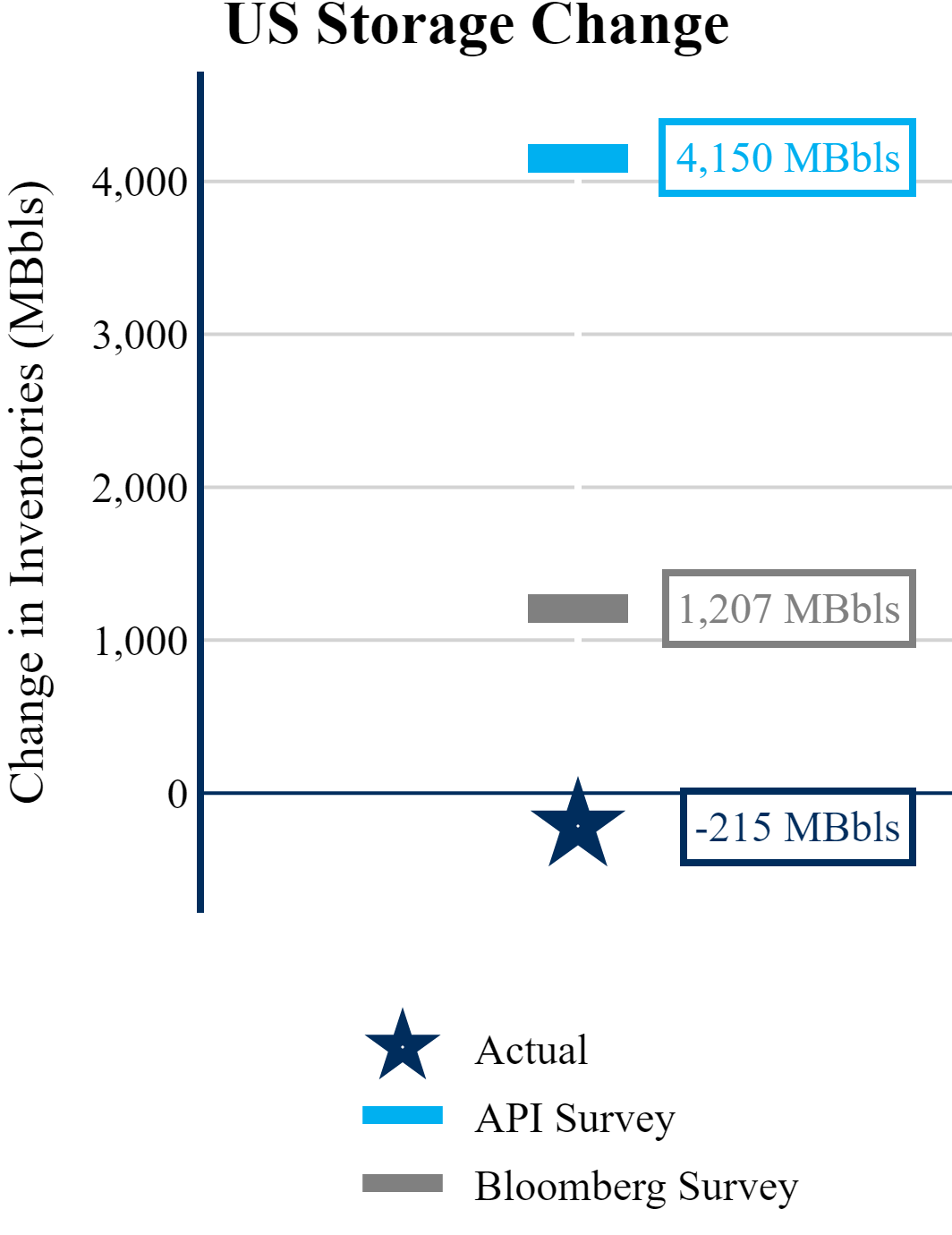 The EIA reported a draw of -215 MBbls in U.S. crude-oil inventories. In contrast, the market expected a build of +1,207 MBbls as reported by Bloomberg.
