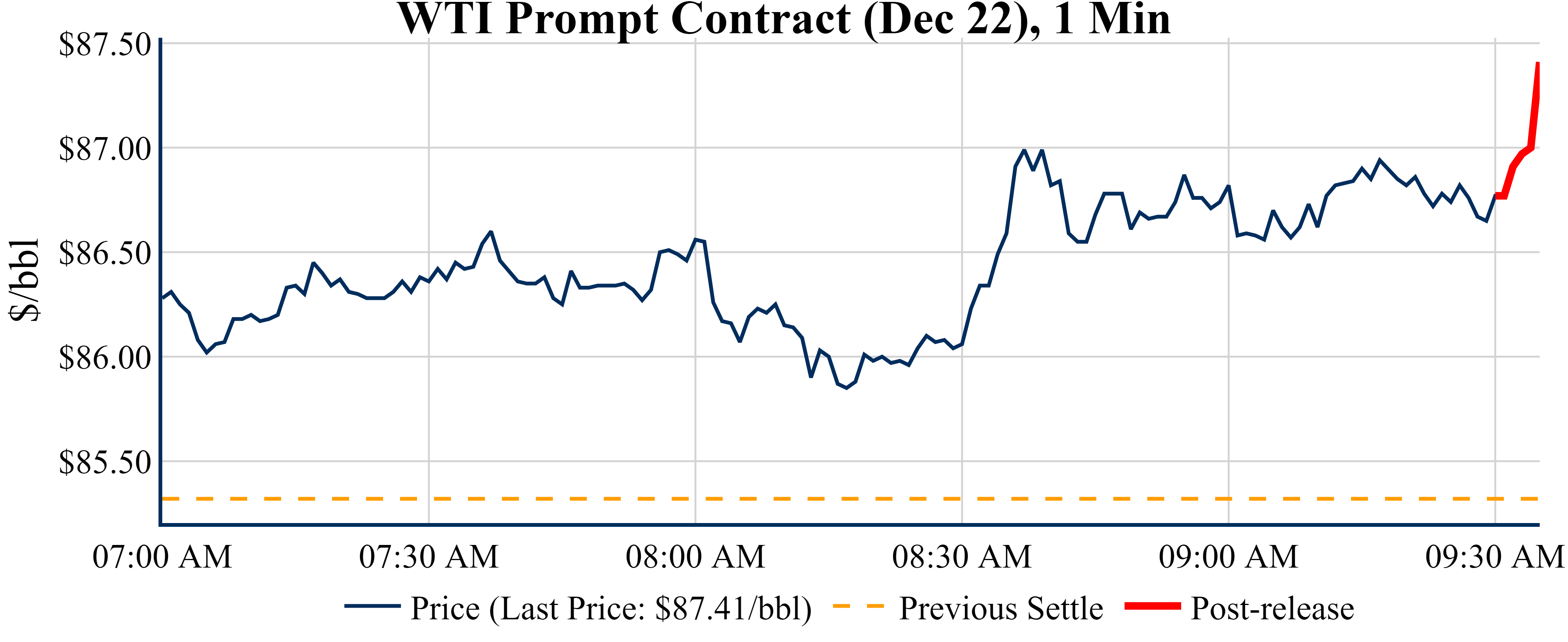 Prices were up in the five minutes following the announcement, to $87.41 from $86.77 just before 09:30 AM.