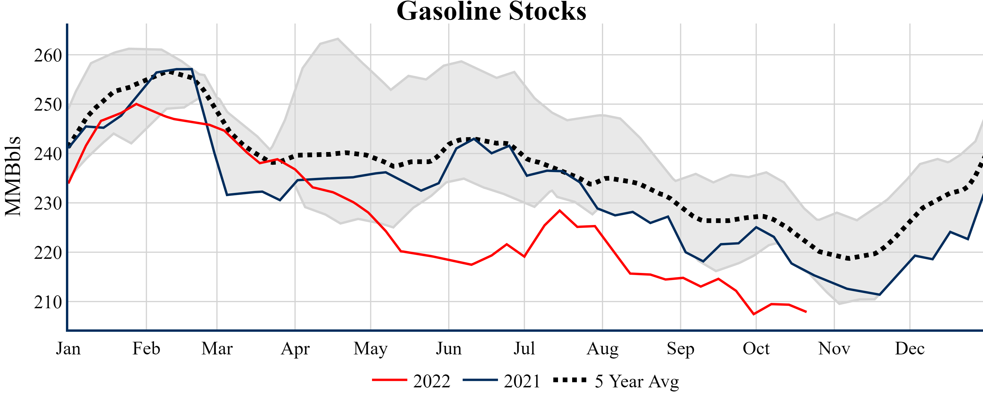 Inventories for the U.S. are now at a surplus of 9.70 MMBbls (2.3%) to last year, and a deficit of 7.50 MMBbls (-1.7%) to the five-year average.