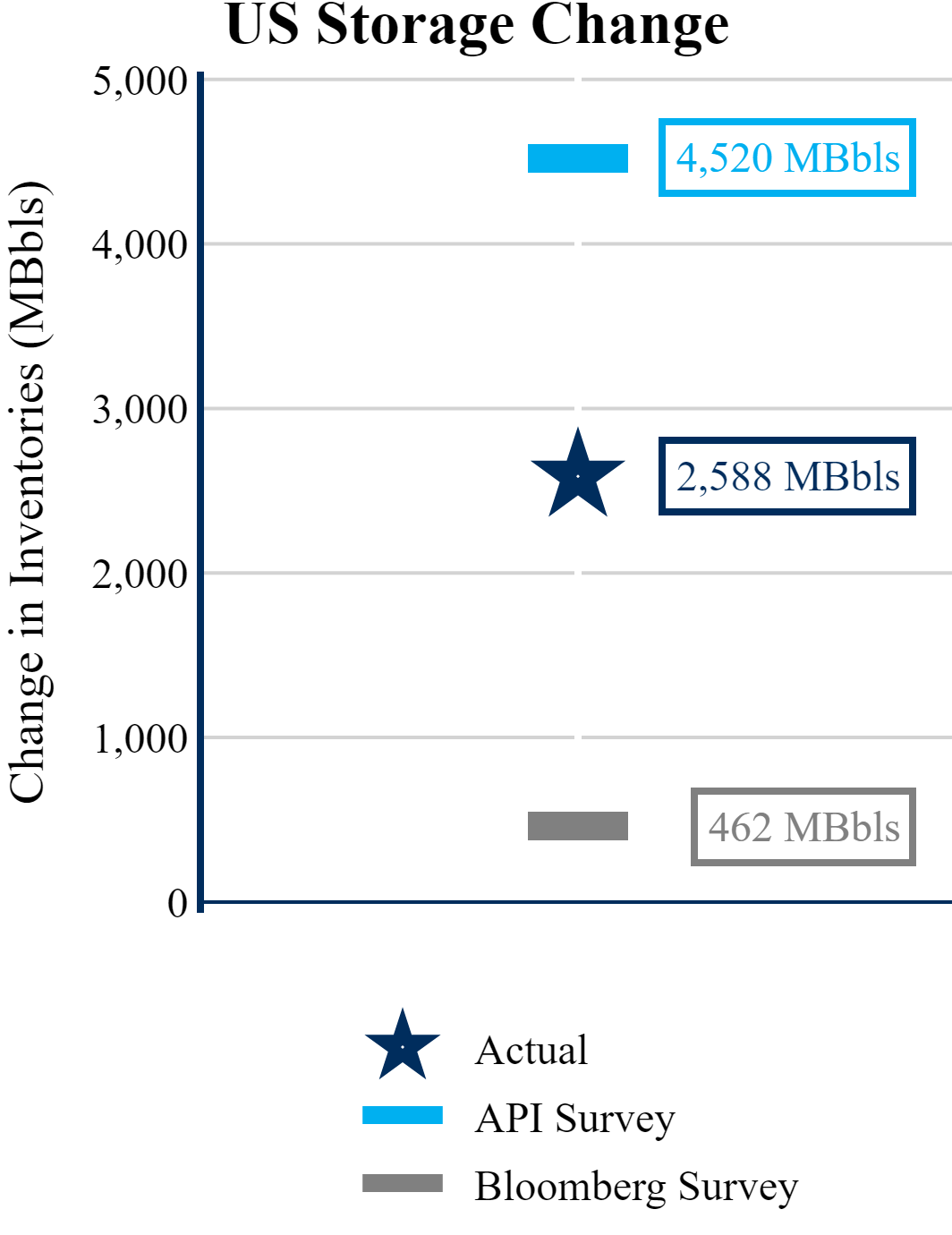 The EIA reported a build of +2,588 MBbls in U.S. crude-oil inventories. The build was larger than the average estimate of +462 as reported by Bloomberg.