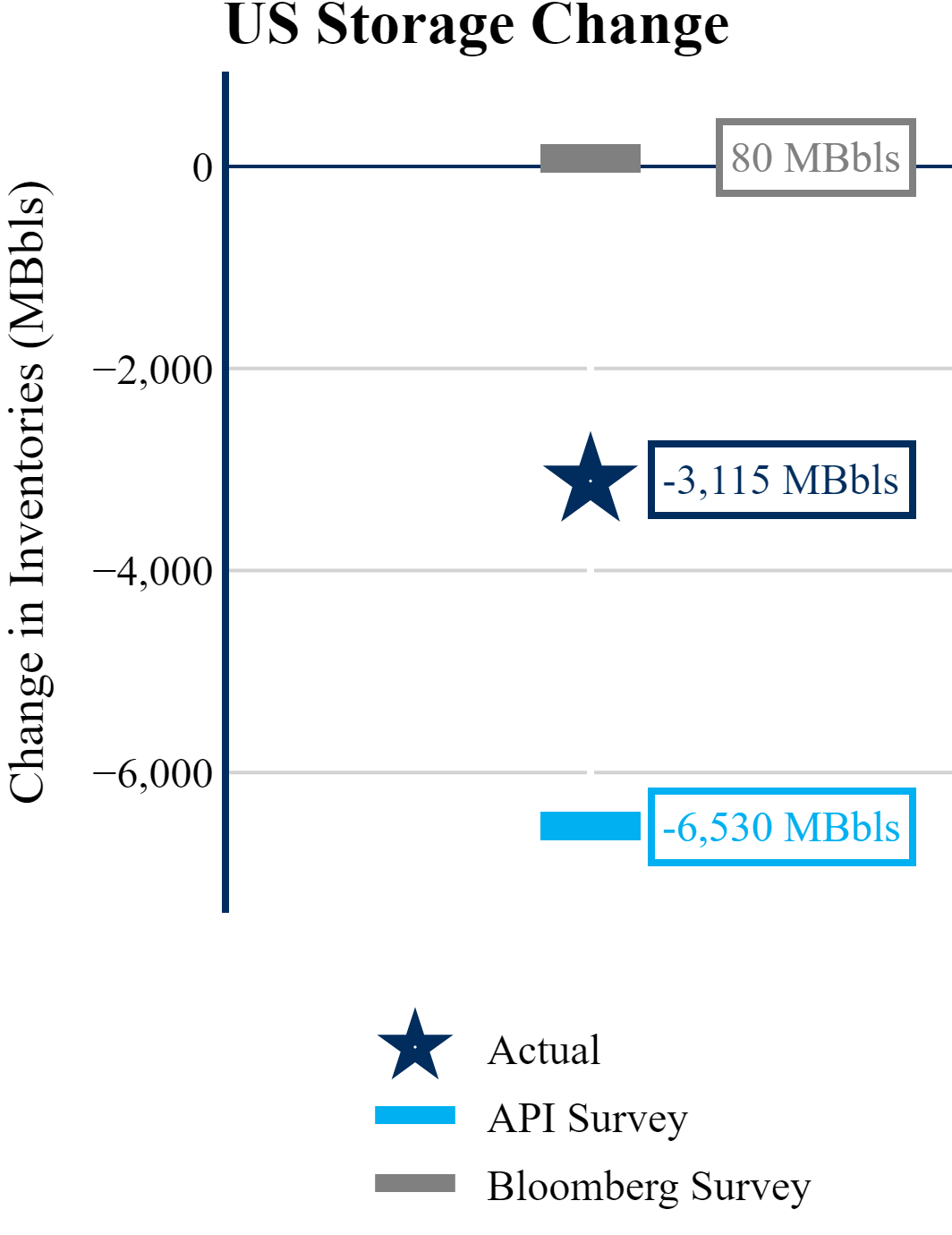 The EIA reported a draw of -3,115 MBbls in U.S. crude-oil inventories. In contrast, the market expected a build of +80 MBbls as reported by Bloomberg.