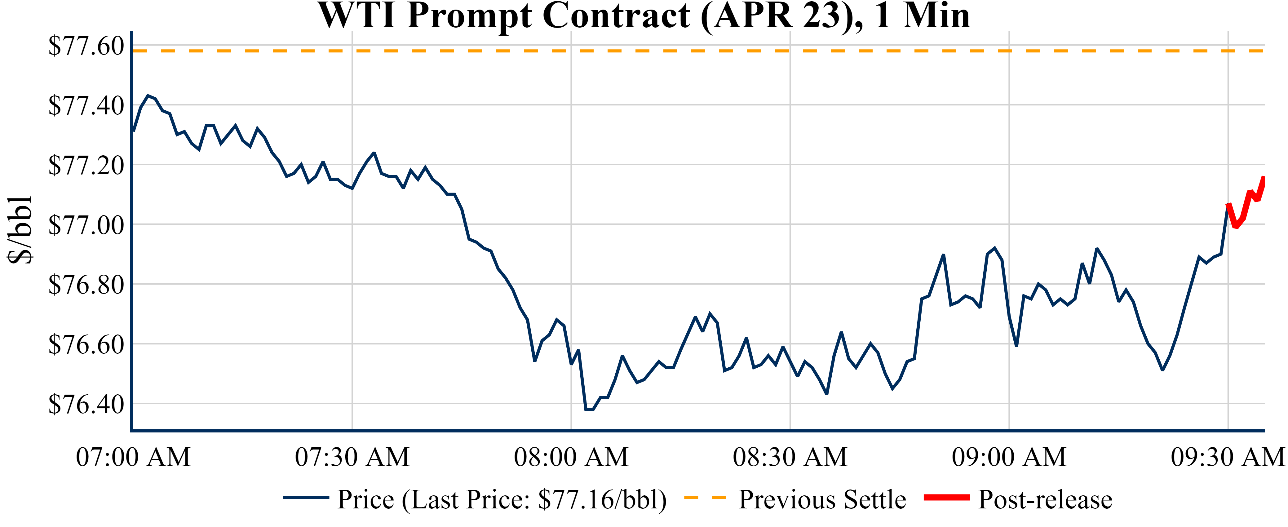 Prices were up in the five minutes following the announcement, to $77.16 from $77.07 just before 09:30 AM.