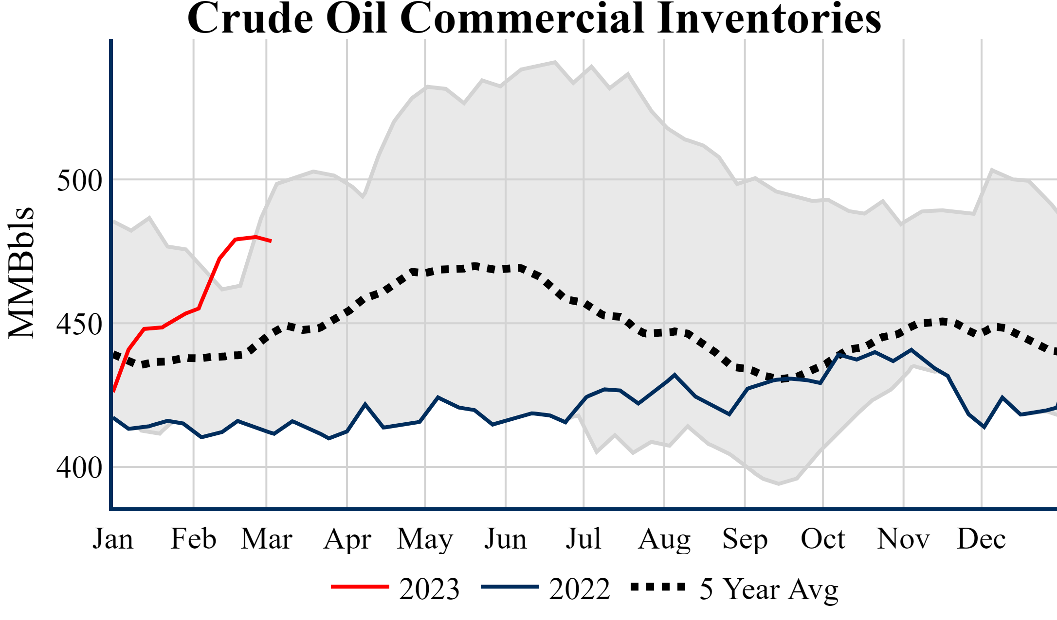 Inventories for the U.S. are now at a surplus of 66.70 MMBbls (16.2%) to last year, and a surplus of 32.10 MMBbls (7.2%) to the five-year average.