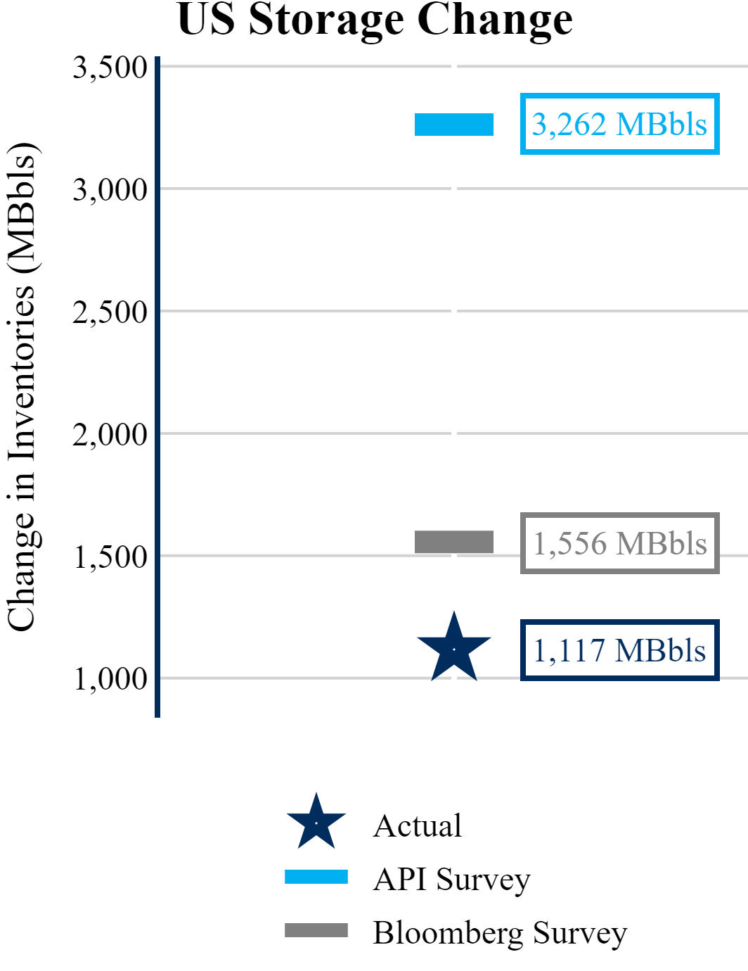 The EIA reported a build of +1,117 MBbls in U.S. crude-oil inventories. The build was smaller than the average estimate of +1,556 as reported by Bloomberg.