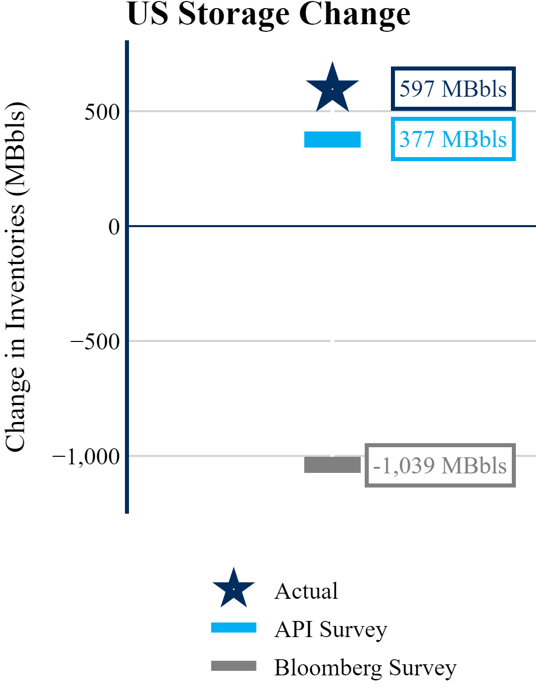 The EIA reported a build of +597 MBbls in U.S. crude-oil inventories. In contrast, the market expected a draw of -1,039 MBbls as reported by Bloomberg.