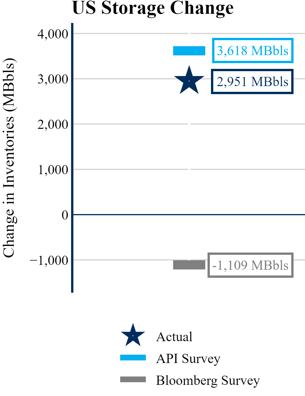 The EIA reported a build of +2,951 MBbls in U.S. crude-oil inventories. In contrast, the market expected a draw of -1,109 MBbls as reported by Bloomberg.