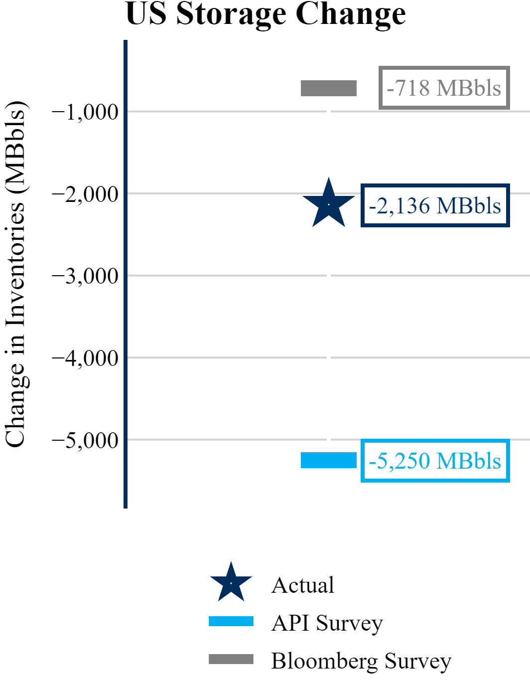 The EIA reported a draw of -2,136 MBbls in U.S. crude-oil inventories. The draw was larger than the average estimate of -718 as reported by Bloomberg.