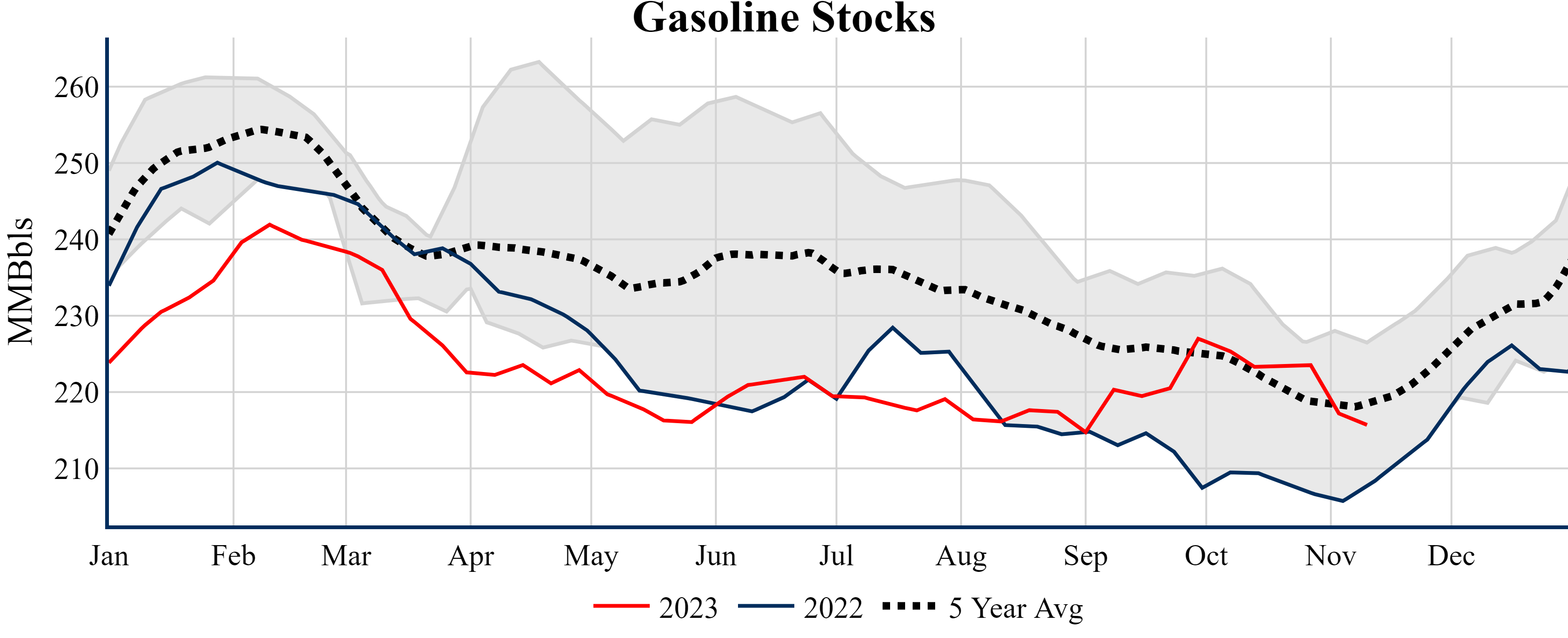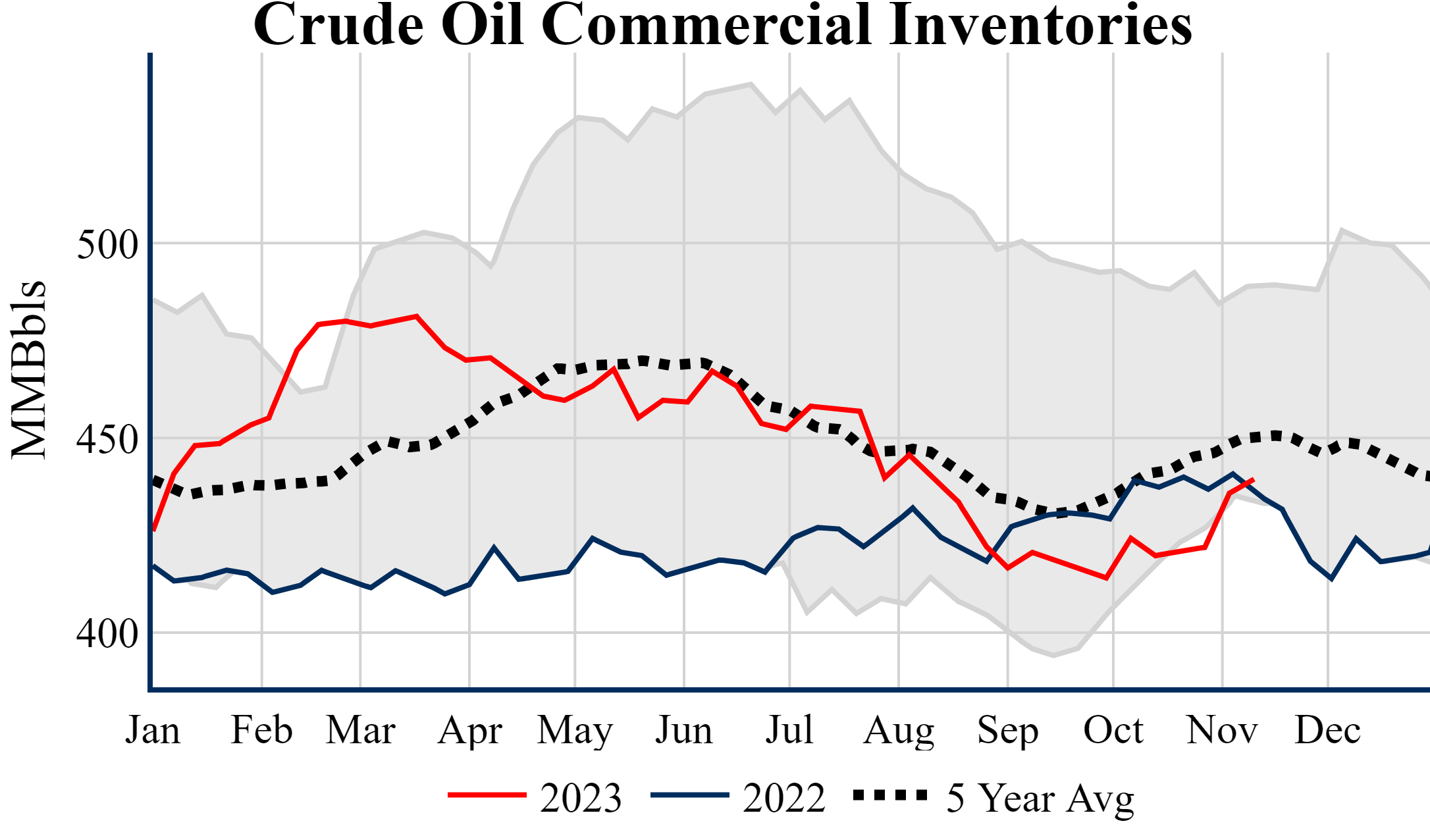 Inventories for the U.S. are now at a surplus of 3.30 MMBbls (0.8%) to last year, and a deficit of 10.80 MMBbls (-2.4%) to the five-year average.