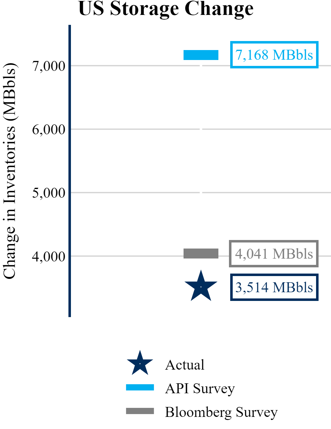 The EIA reported a build of +3,514 MBbls in U.S. crude-oil inventories. The build was smaller than the average estimate of +4,041 as reported by Bloomberg.