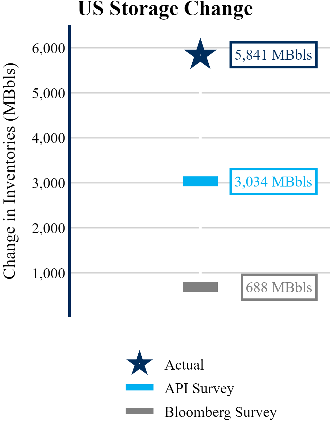 The EIA reported a build of +5,841 MBbls in U.S. crude-oil inventories. The build was larger than the average estimate of +688 as reported by Bloomberg.