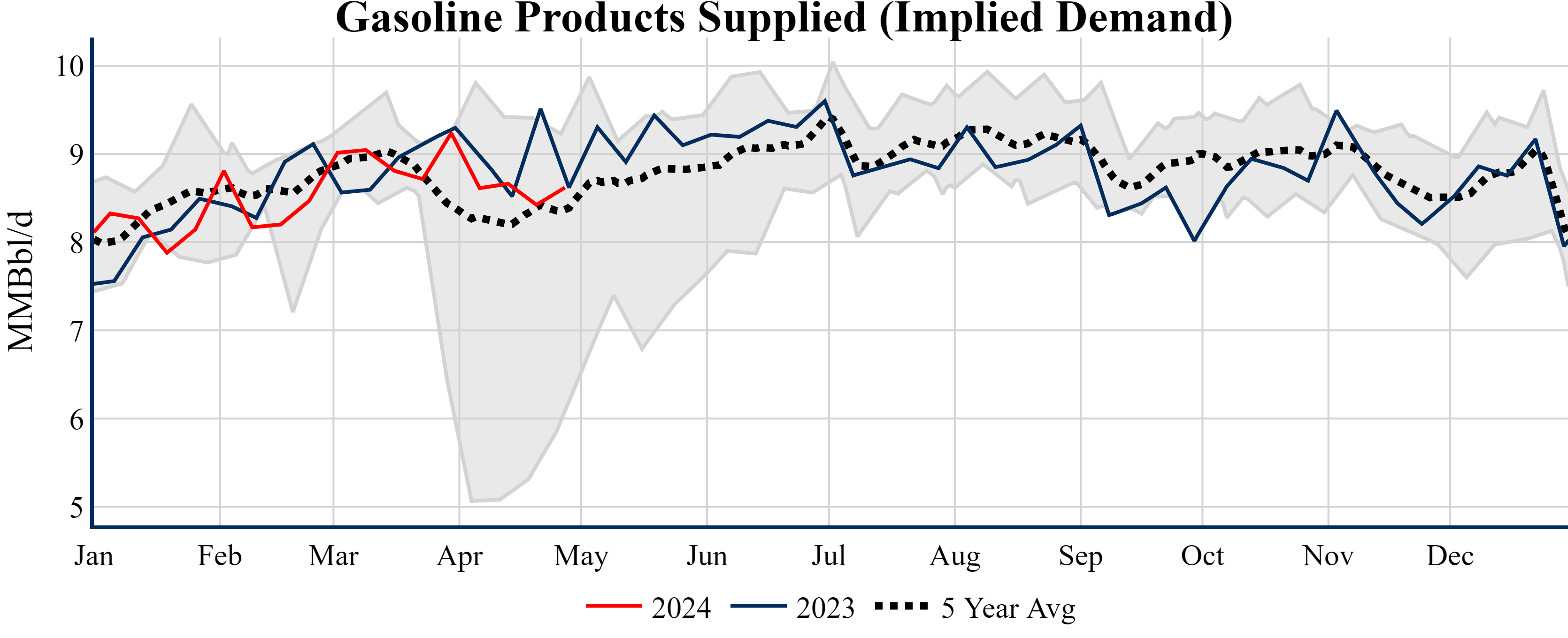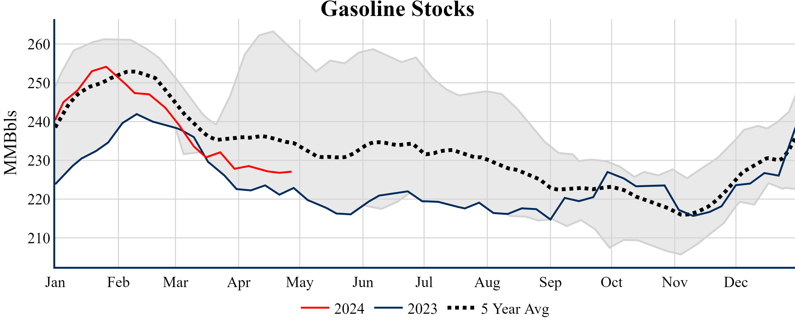 Inventories for the U.S. are now at a surplus of 1.10 MMBbls (0.2%) to last year, and a deficit of 11.60 MMBbls (-2.5%) to the five-year average.