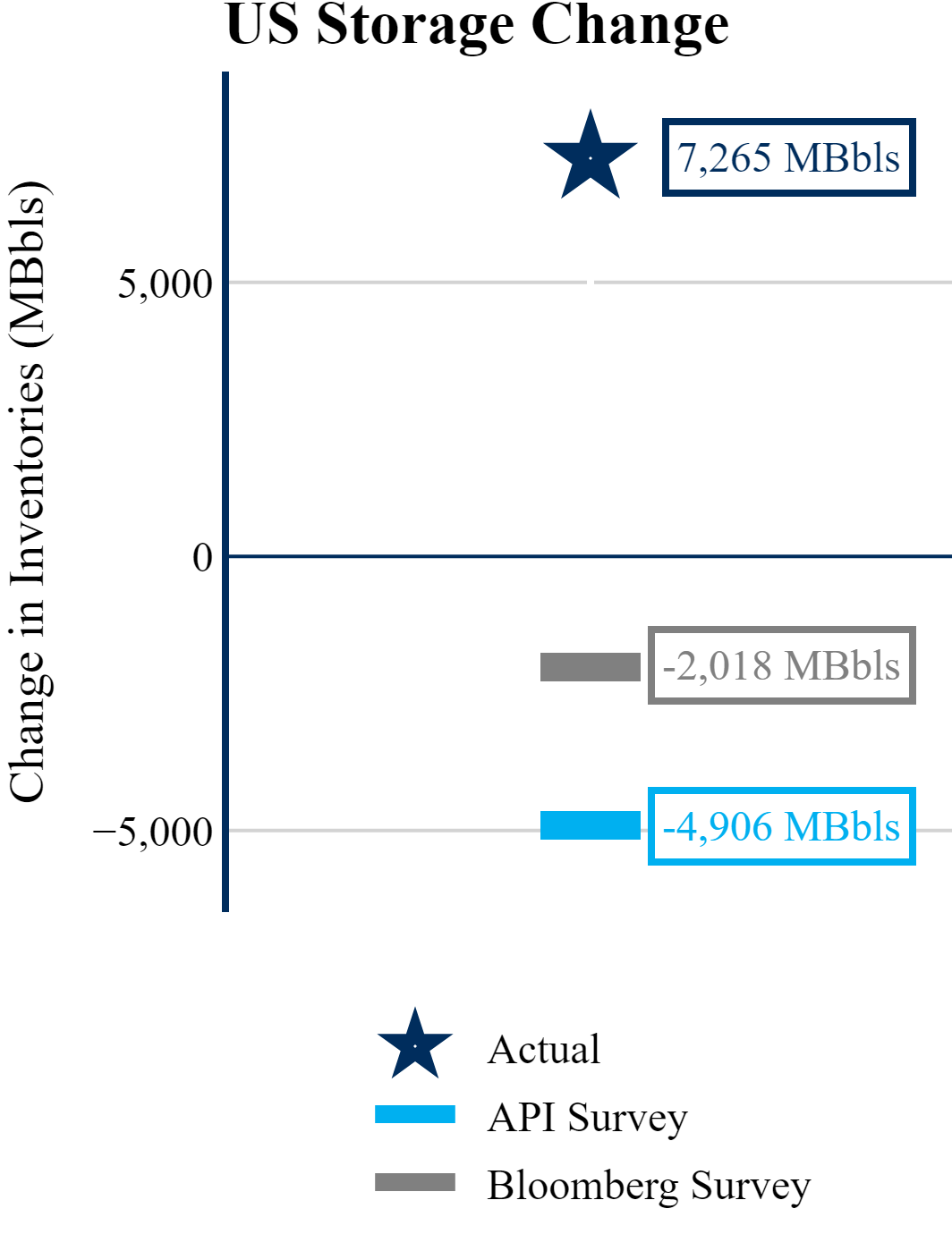 The EIA reported a build of +7,265 MBbls in U.S. crude-oil inventories. In contrast, the market expected a draw of -2,018 MBbls as reported by Bloomberg.