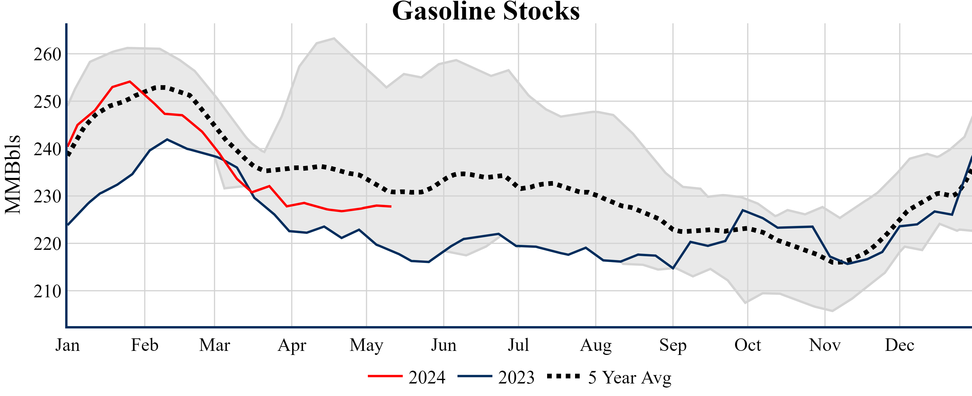 Inventories for the U.S. are now at a deficit of 9.90 MMBbls (-2.1%) to last year, and a deficit of 18.40 MMBbls (-3.9%) to the five-year average.