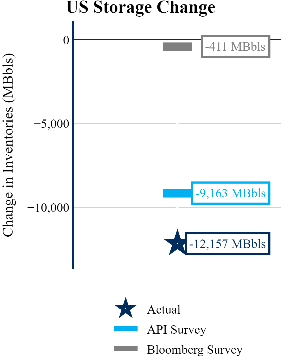 The EIA reported a draw of -12,157 MBbls in U.S. crude-oil inventories. The draw was larger than the average estimate of -411 as reported by Bloomberg.