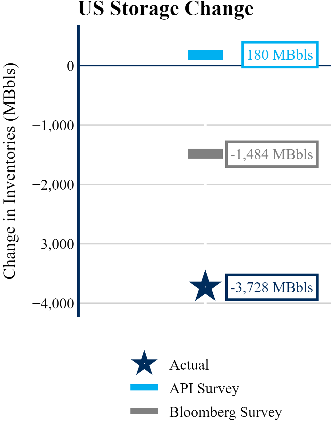 The EIA reported a draw of -3,728 MBbls in U.S. crude-oil inventories. The draw was larger than the average estimate of -1,484 as reported by Bloomberg.