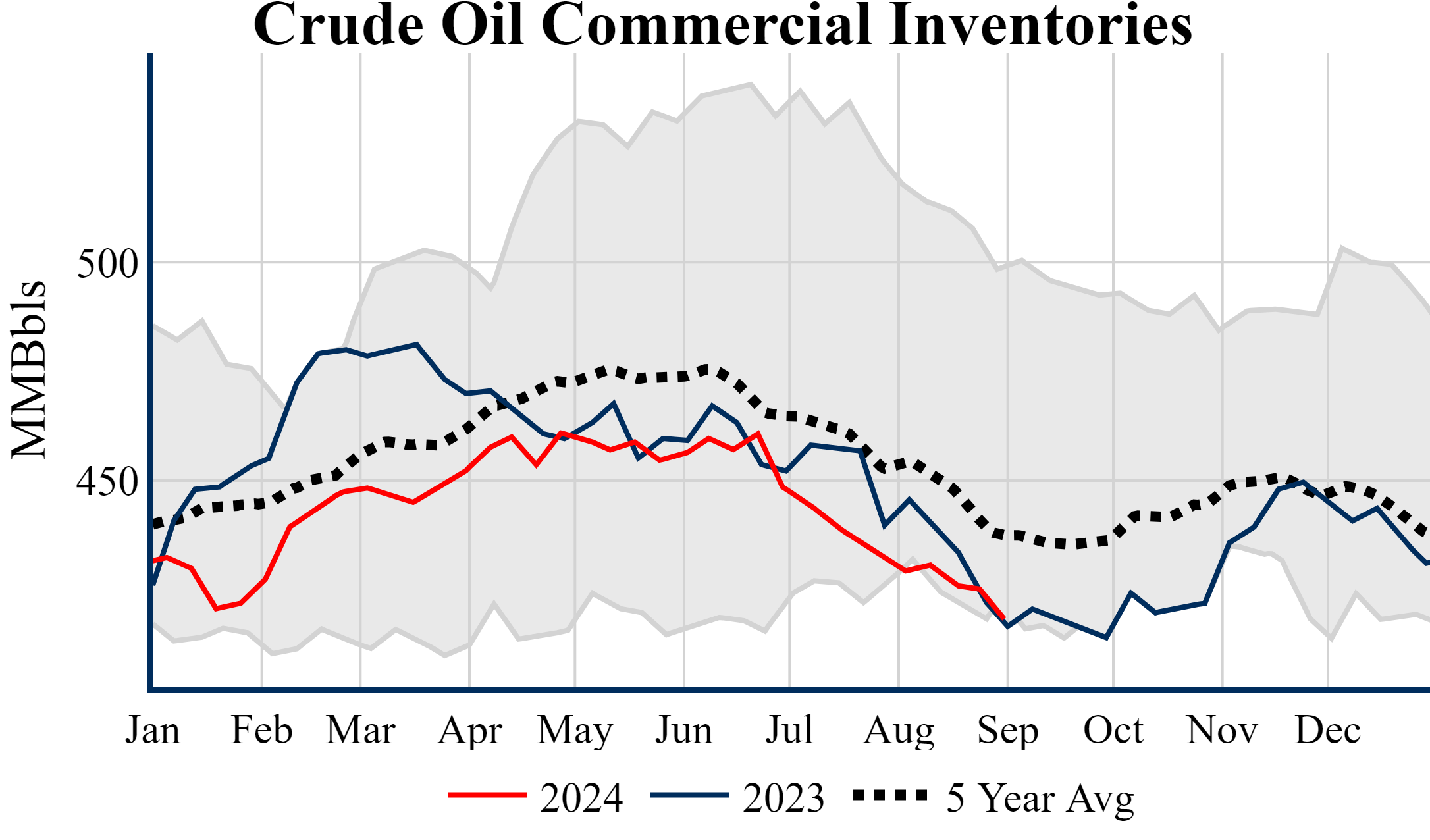 Inventories for the U.S. are now at a surplus of 0.80 MMBbls (0.2%) to last year, and a deficit of 19.20 MMBbls (-4.4%) to the five-year average.