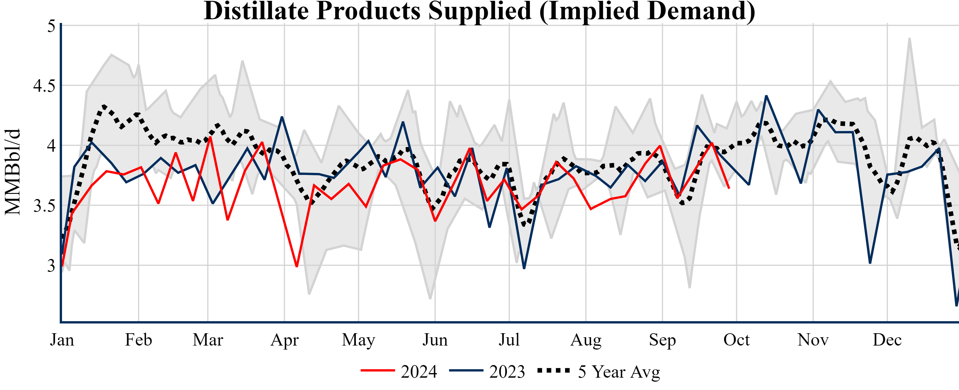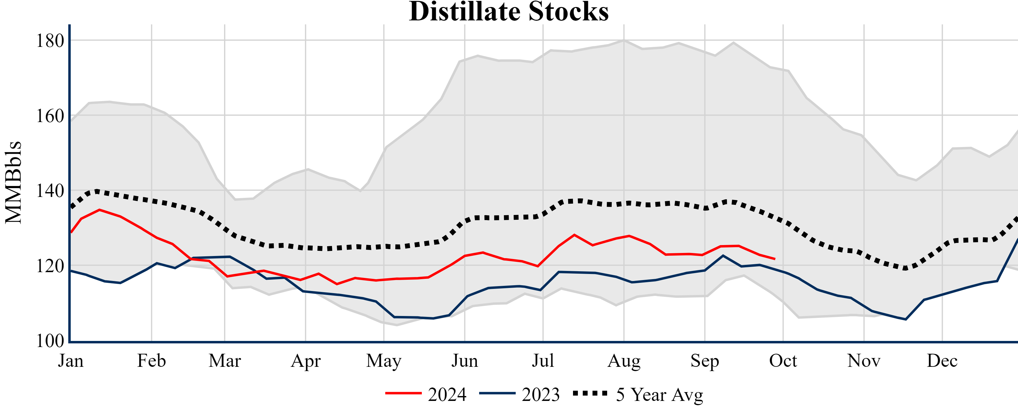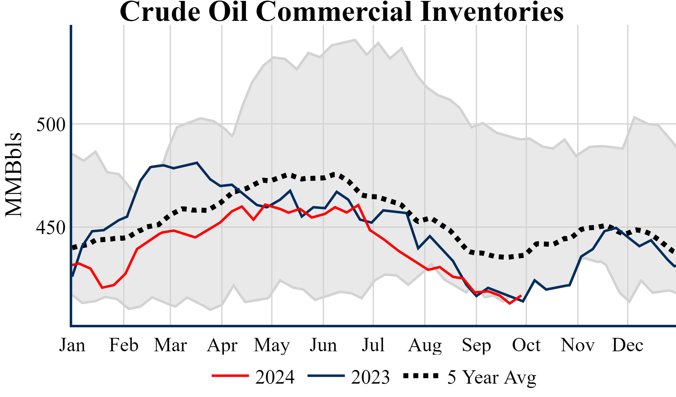Inventories for the U.S. are now at a surplus of 2.60 MMBbls (0.6%) to last year, and a deficit of 19.00 MMBbls (-4.4%) to the five-year average.