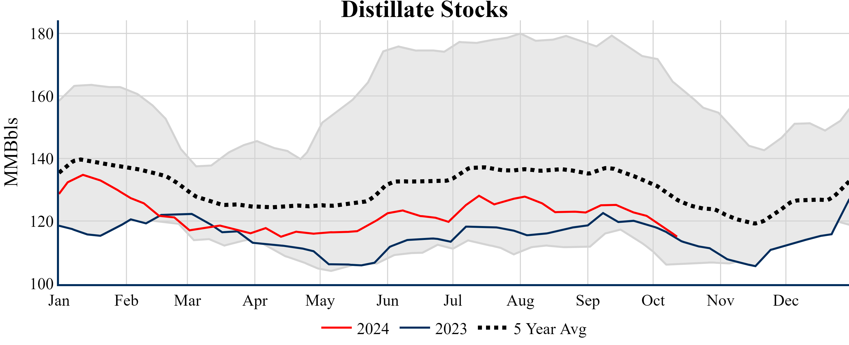 Inventories for the U.S. are now at a surplus of 0.20 MMBbls (0.0%) to last year, and a deficit of 21.10 MMBbls (-4.8%) to the five-year average.
