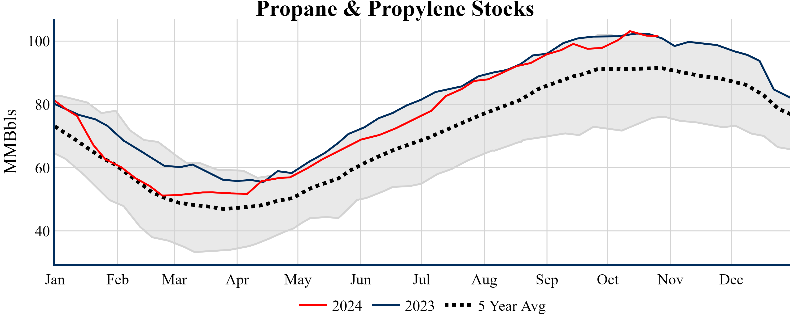 Inventories for the U.S. are now at a surplus of 3.70 MMBbls (0.9%) to last year, and a deficit of 19.00 MMBbls (-4.3%) to the five-year average.