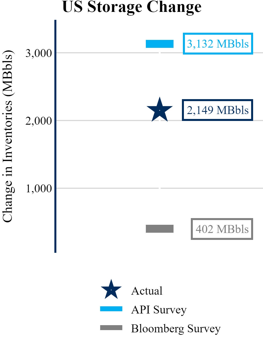 The EIA reported a build of +2,149 MBbls in U.S. crude-oil inventories. The build was larger than the average estimate of +402 as reported by Bloomberg.