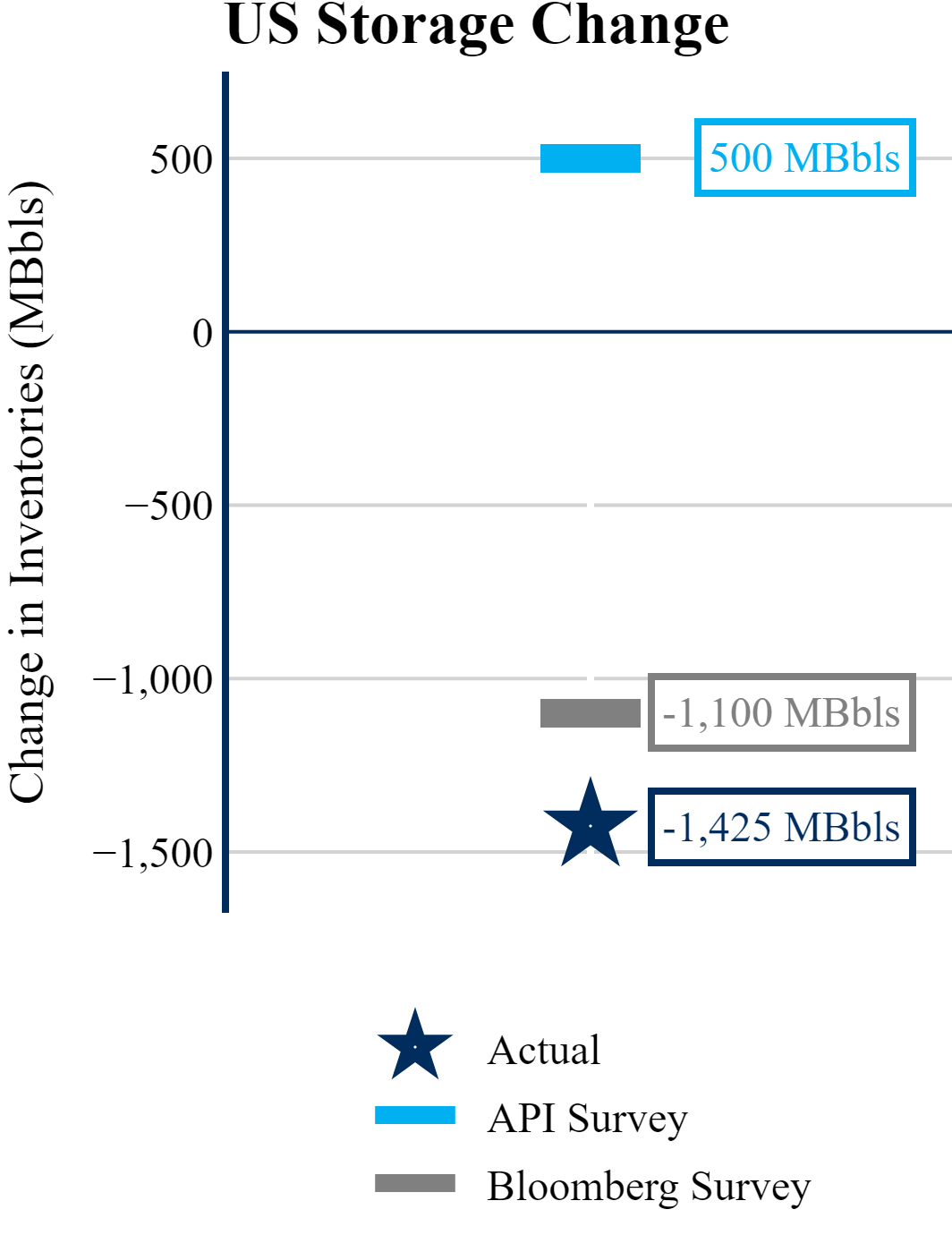 The EIA reported a draw of -1,425 MBbls in U.S. crude-oil inventories. The draw was larger than the average estimate of -1,100 as reported by Bloomberg.