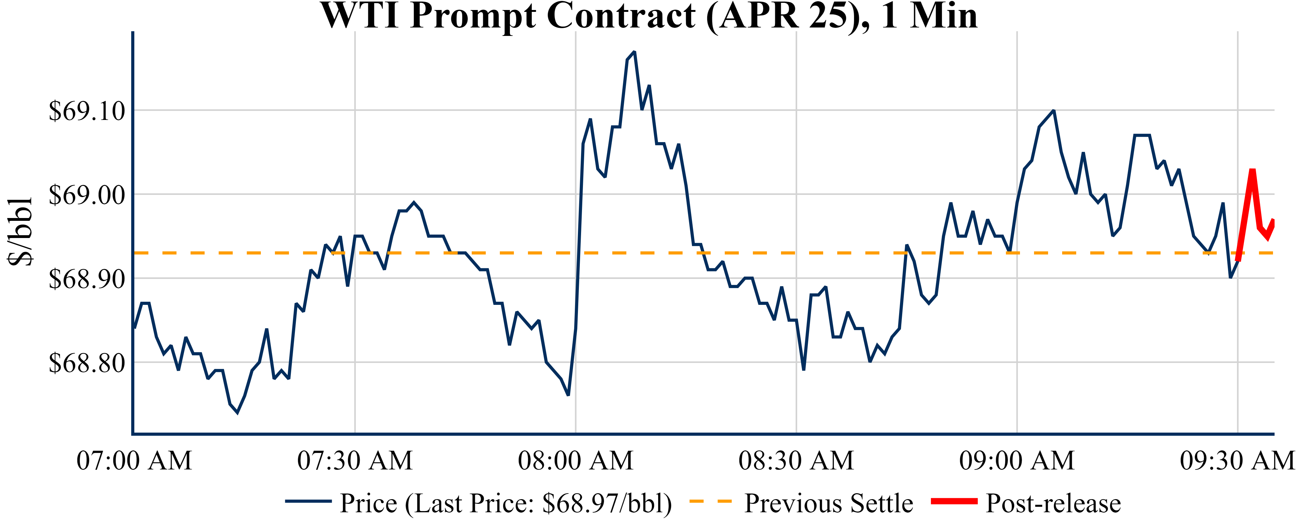 Prices were up in the five minutes following the announcement, to $68.97 from $68.92 just before 09:30 AM.