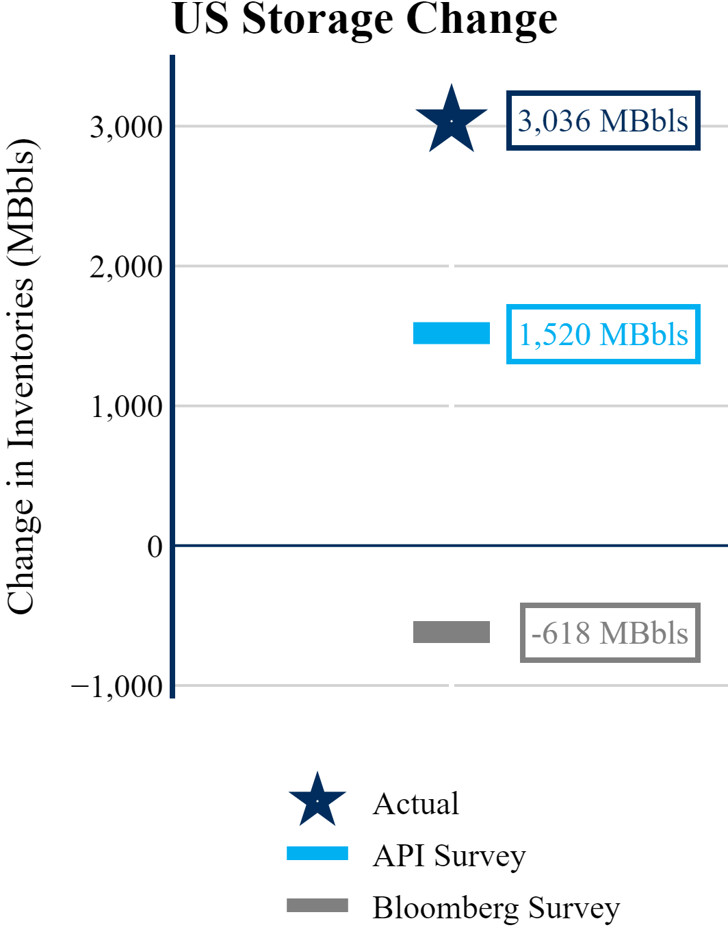 The EIA reported a build of +3,036 MBbls in U.S. crude-oil inventories. In contrast, the market expected a draw of -618 MBbls as reported by Bloomberg.
