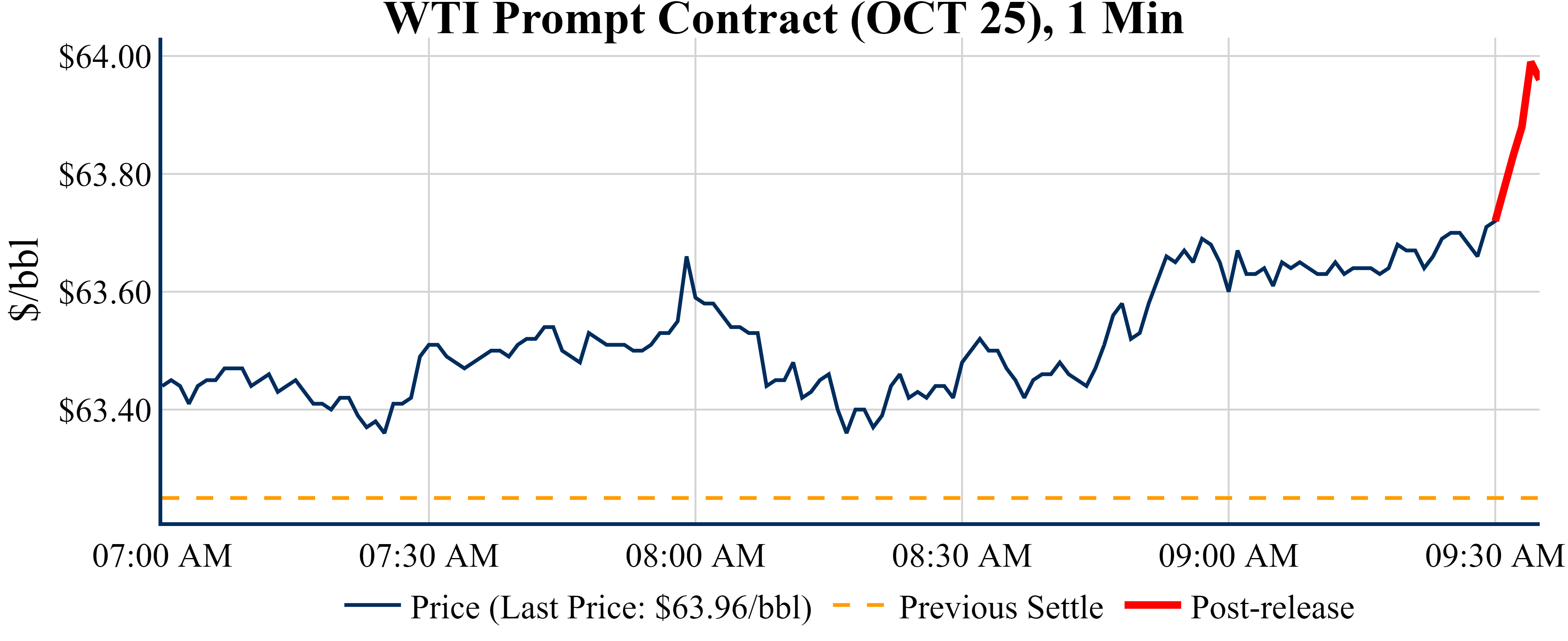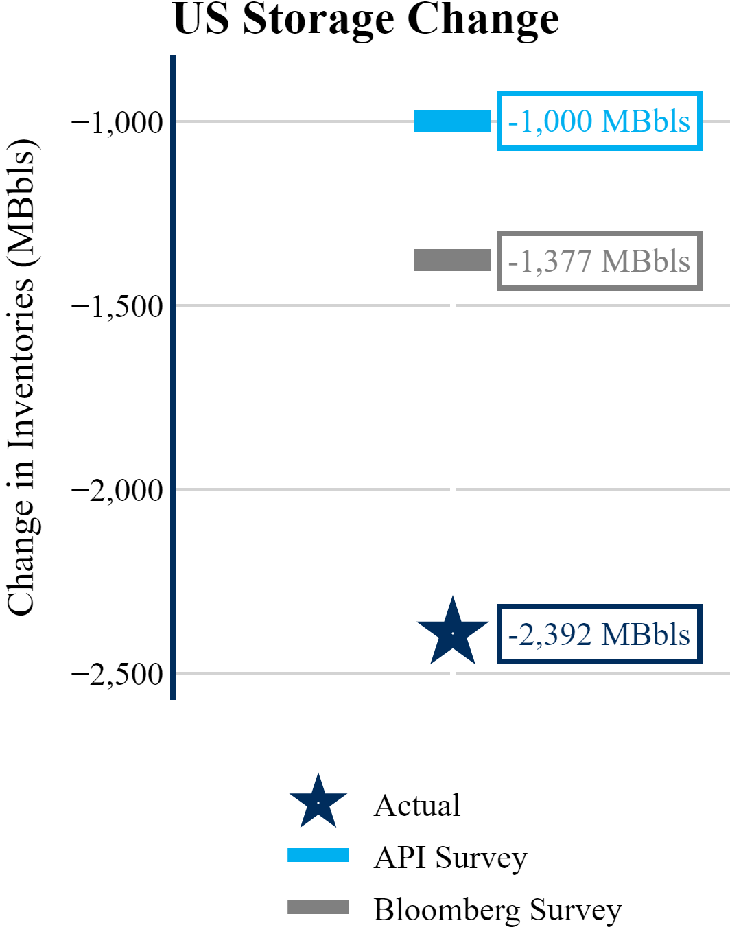 The EIA reported a draw of 2,392 MBbls in U.S. crude-oil inventories. The draw was larger than the average estimate of -1,377 as reported by Bloomberg.