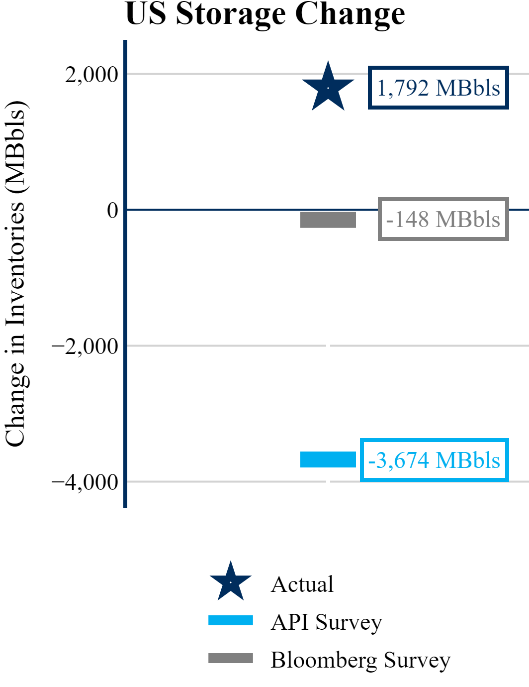 The EIA reported a build of +1,792 MBbls in U.S. crude-oil inventories. In contrast, the market expected a draw of -148 MBbls as reported by Bloomberg.
