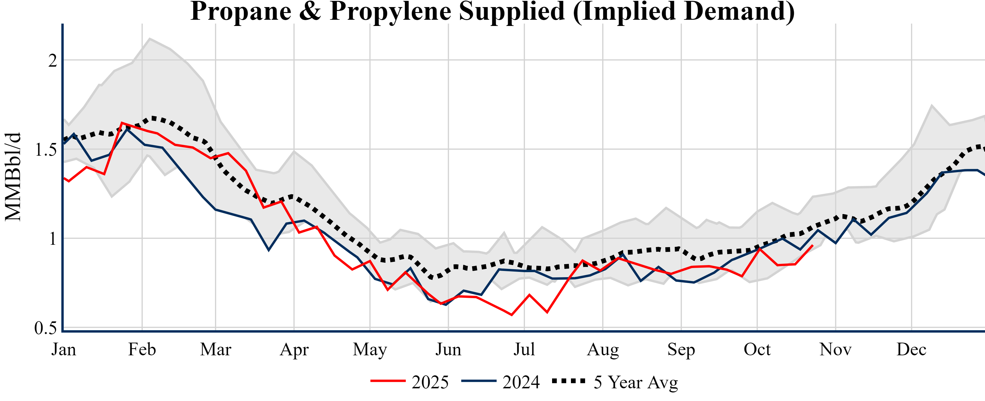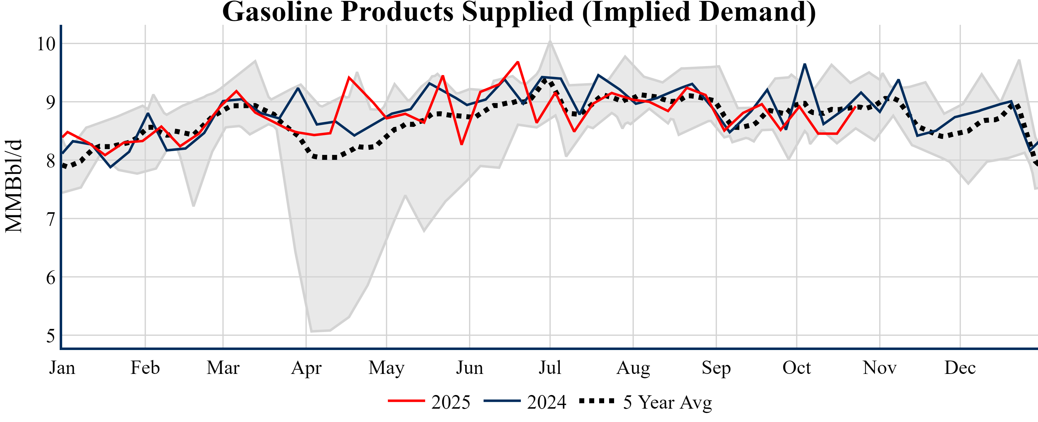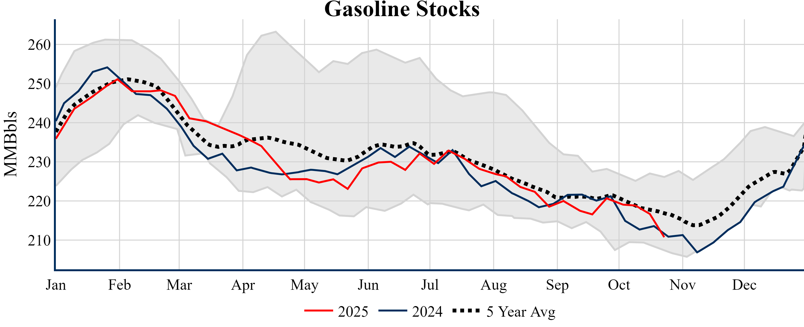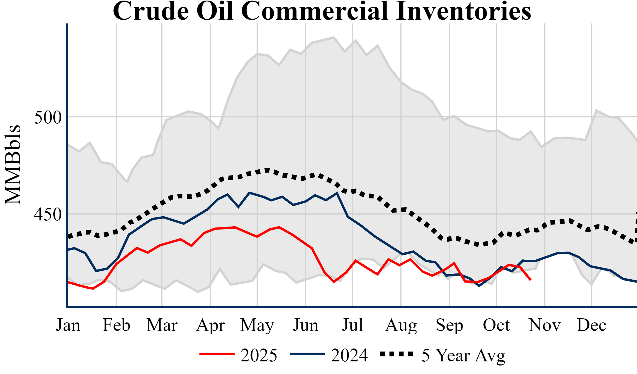 Inventories for the U.S. are now at a deficit of 9.70 MMBbls (-2.3%) to last year, and a deficit of 26.00 MMBbls (-5.9%) to the five-year average.