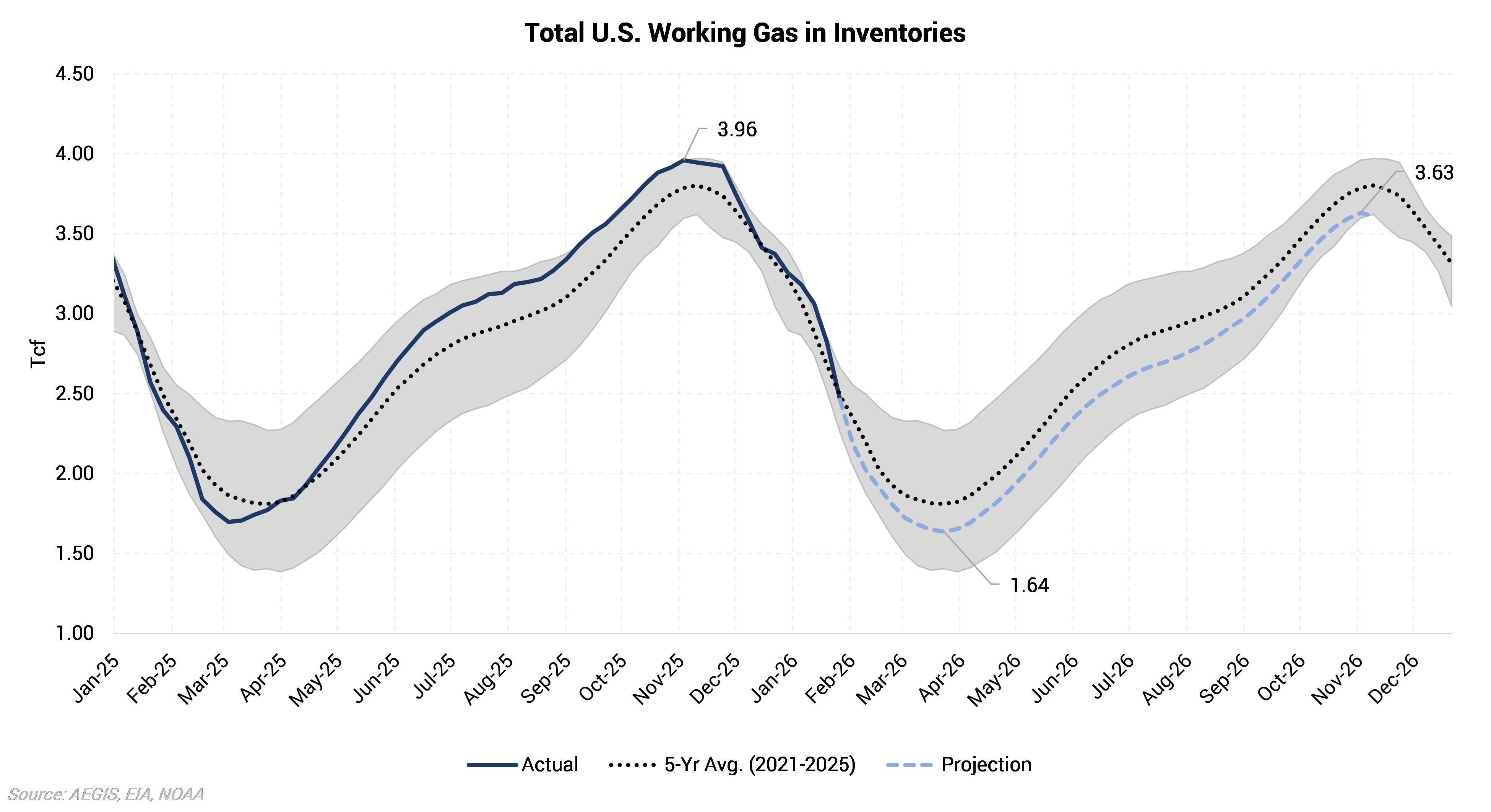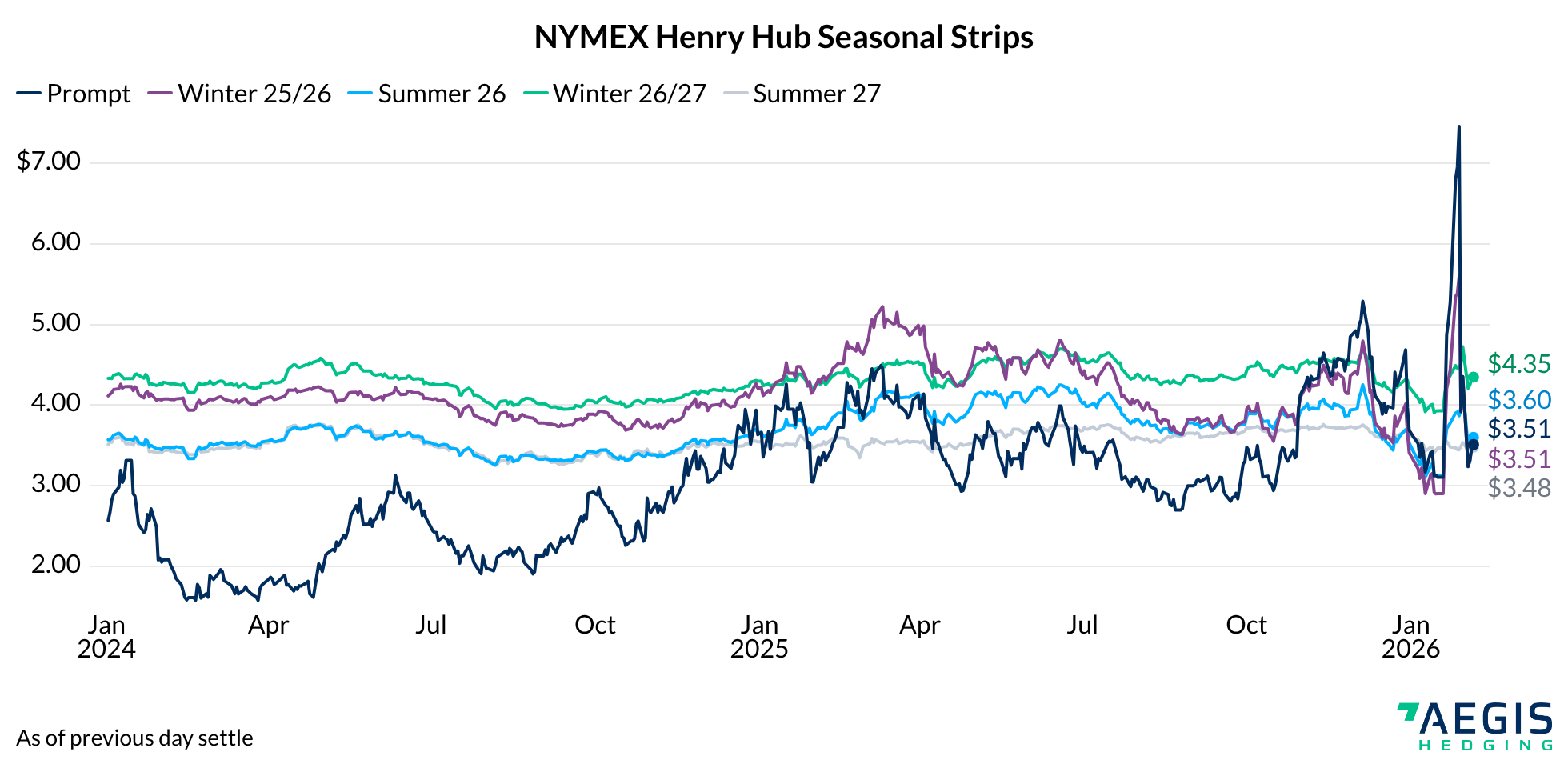 Last week’s winter storm Fern sent natural gas demand higher, supply lower, and resulted in the highest monthly Henry Hub contract settlement since 2022. Most direct impacts from the storm are now behind us, but it has shifted the outlook for gas going forward this year. The storage withdrawal from last week set a new record and has pushed Lower-48 inventories back into a deficit, making it more difficult to build storage this summer in advance of Winter ‘26/’27. This dynamic has led to stronger prices for next summer and winter, although an untimely shift in weather forecasts this week has erased some of those gains.