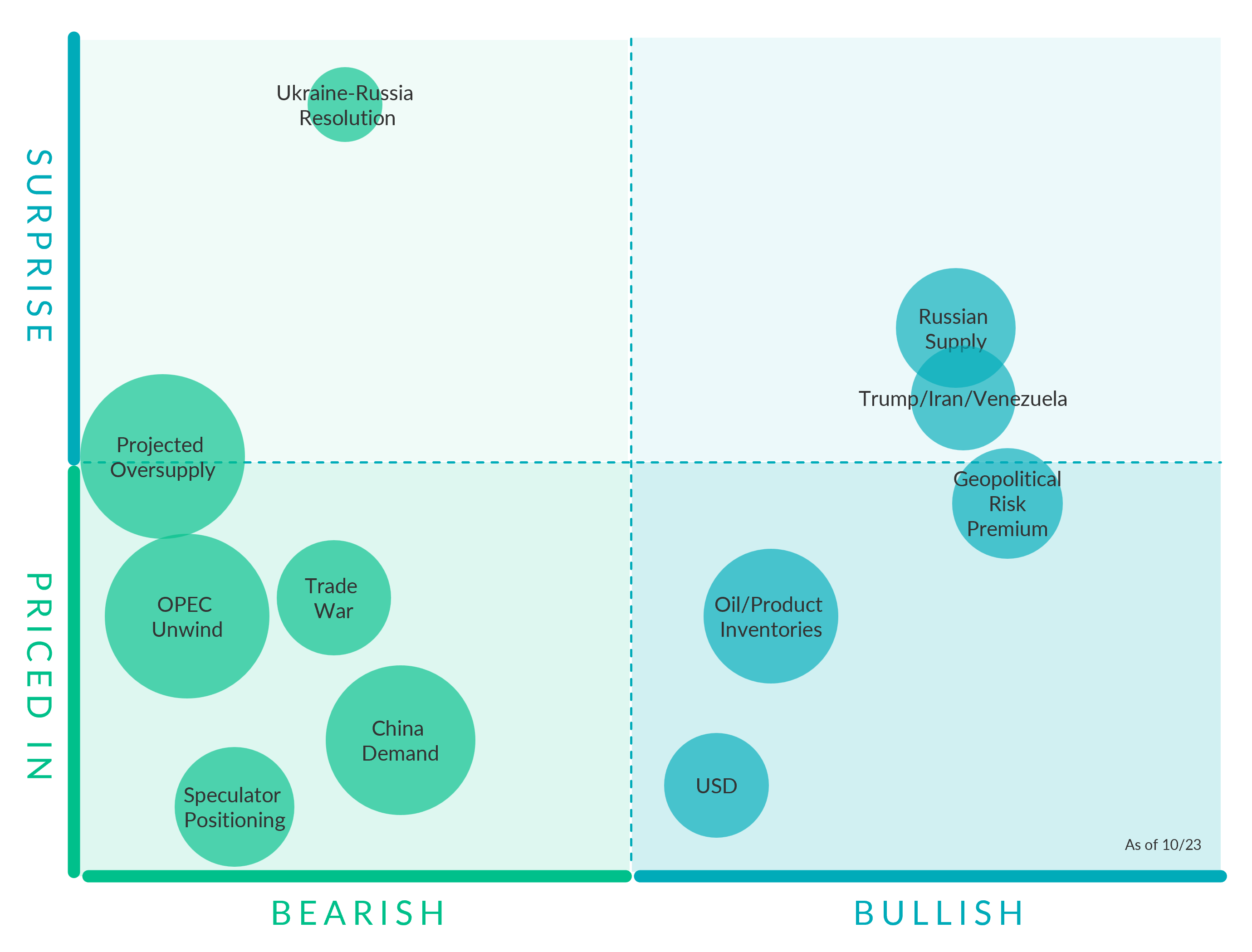 Russian Supply. (Bullish, Slight Surprise) Due to the latest sanction on Rosneft and Lukoil, analysts at Rystad Energy estimate 500–600 MBbl/d of Russian output could be curtailed, forcing Moscow to rely more heavily on shadow tanker fleets and Chinese buyers. However, the extent of any disruption remains uncertain, and it may take time to gauge how material the impact truly is.