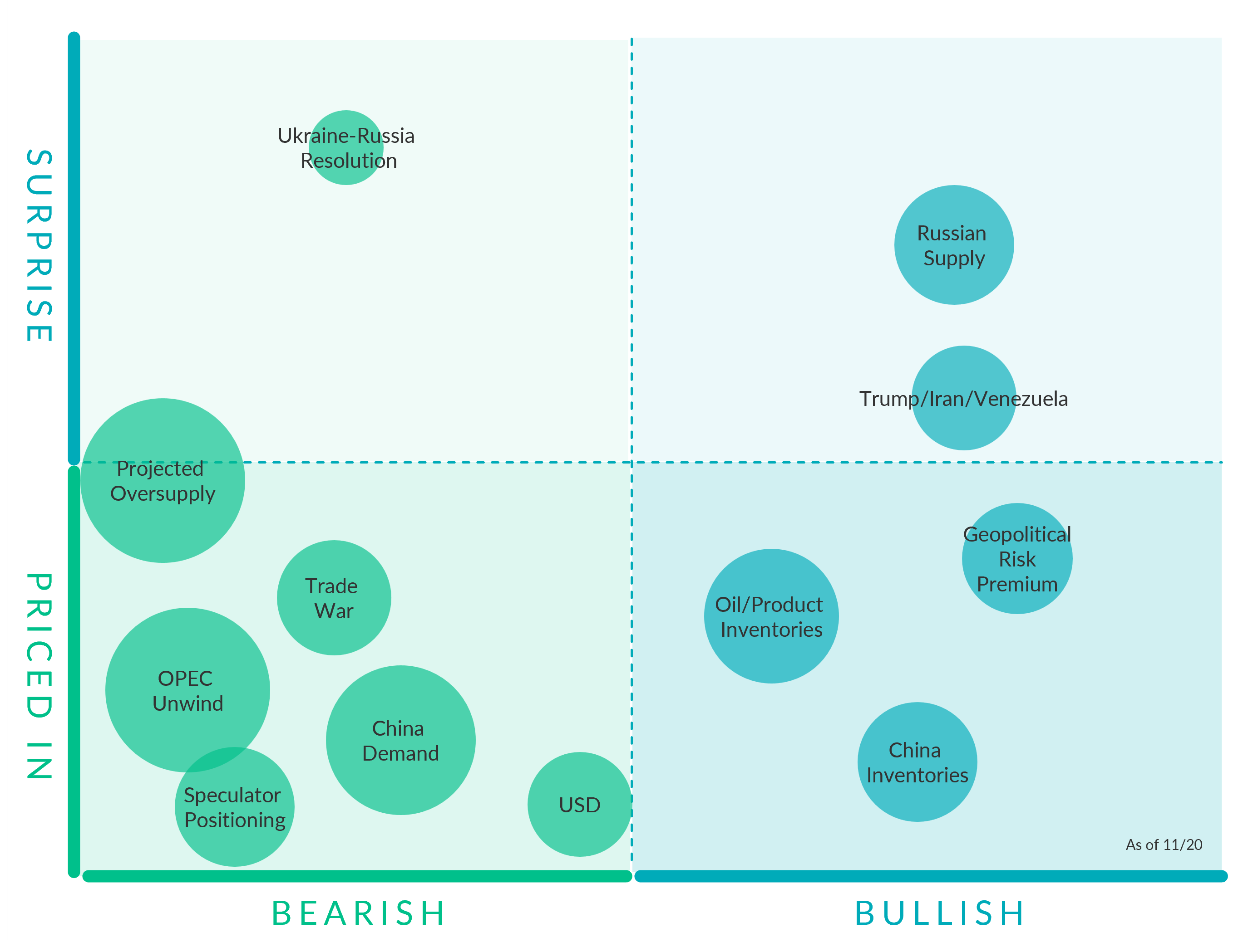 Ukraine-Russia Resolution. (Bearish, Surprise) Ukrainian President Volodymyr Zelensky said he agreed to work on a peace plan drafted by the US and Russia aimed at ending the war in Ukraine. A peace deal, if followed by the elimination of sanctions on Russian oil over its invasion of Ukraine, could unleash supply from the world's third largest producer.