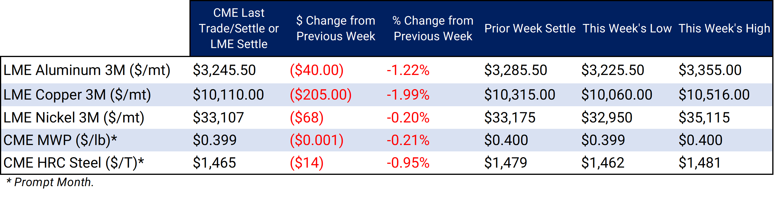 LME Copper 3M settled at $10,110/mt, down $205/mt on the week. The forward curve for LME Copper is currently quite backwardated, meaning that spot prices are higher than futures prices. A backwardated forward curve favors the consumer hedger. The copper market has sufficient liquidity to use swaps and options. Consumers might consider strategies that use only swaps or options or a combination of both, depending upon your risk tolerance. Please contact AEGIS for specific strategies that fit your operations.