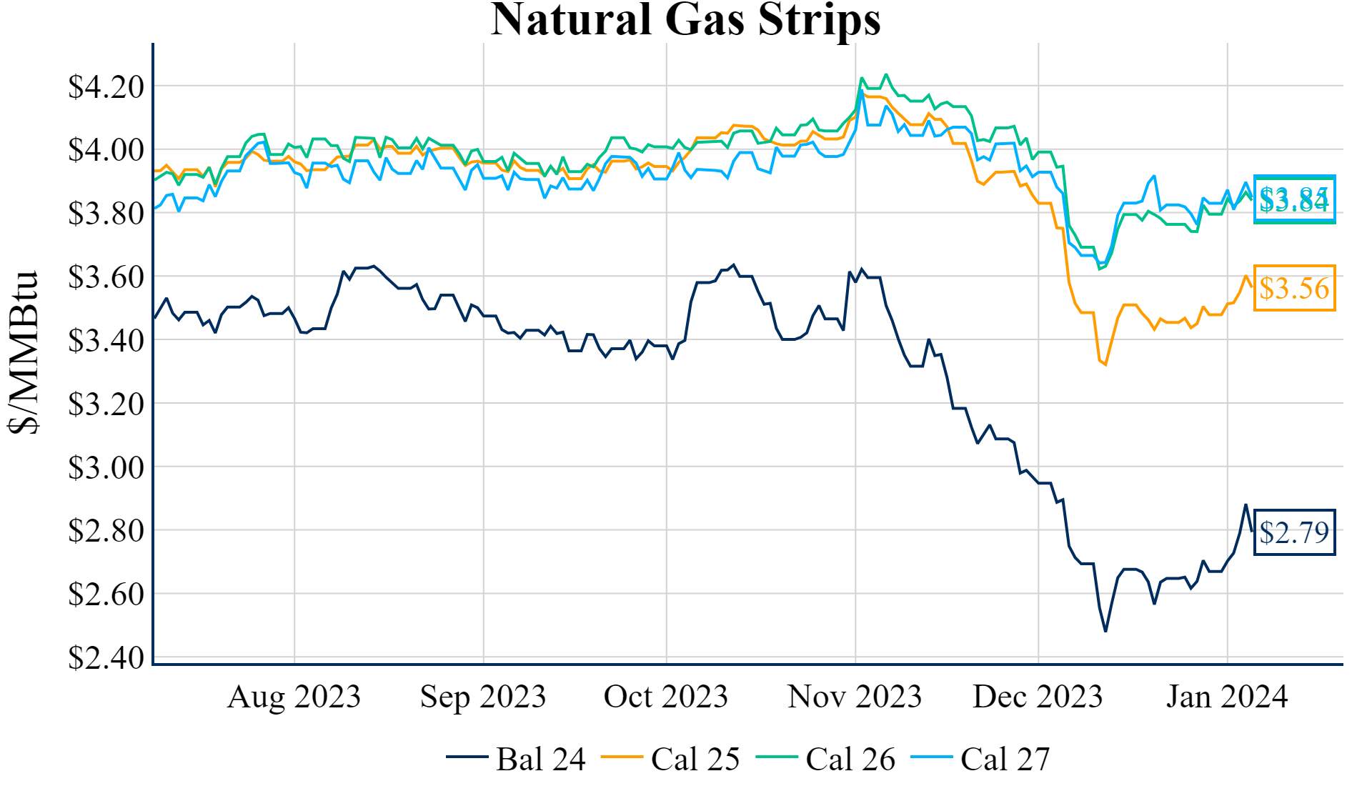 The Winter ‘23/’24 strip is down 12.5c to $2.590, and the Summer ’24 strip is down 7.2c to $2.691