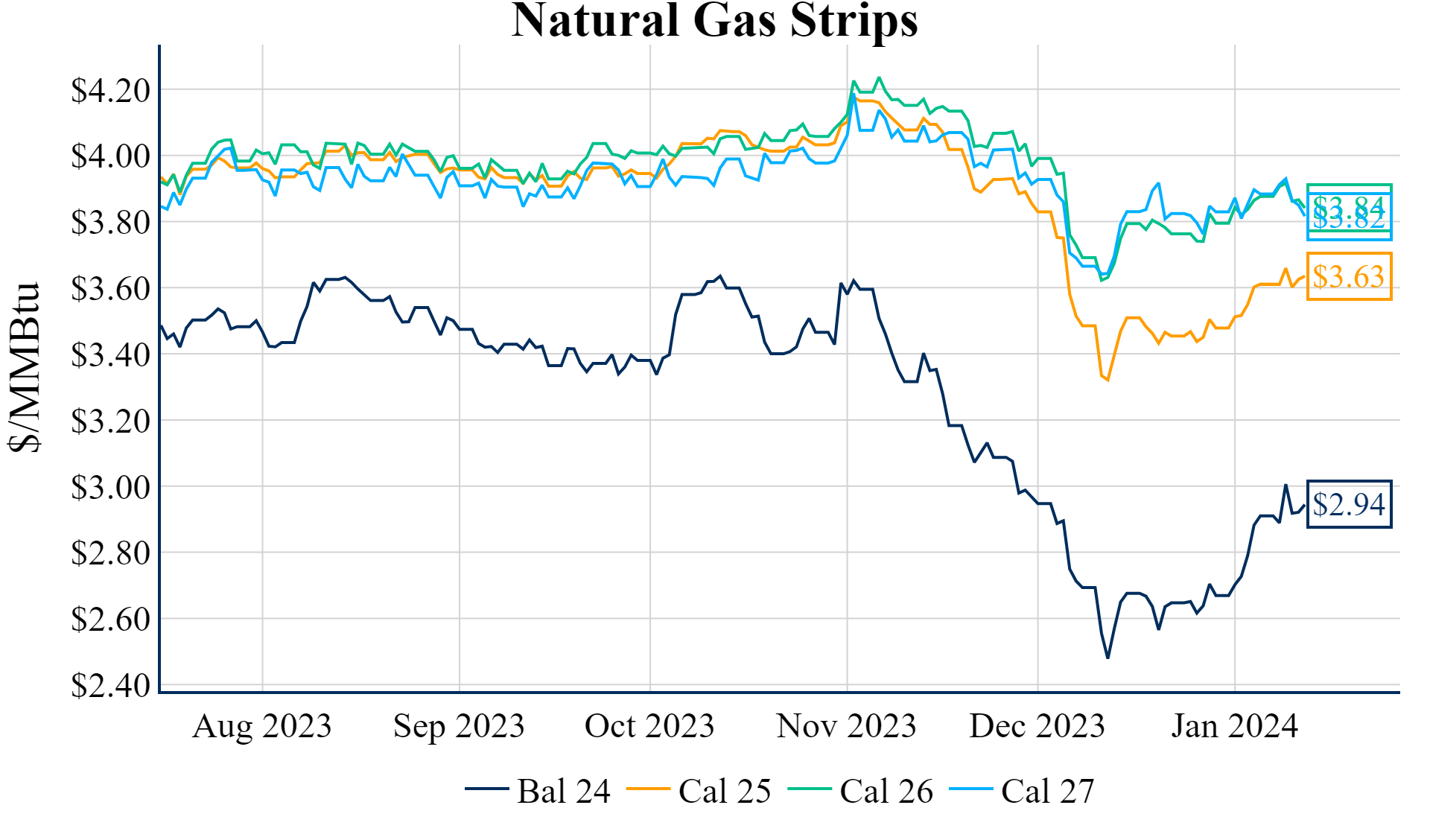 The Winter ‘23/’24 strip is up 9.3c to $2.927, and the Summer ’24 strip is up 2c to $2.807