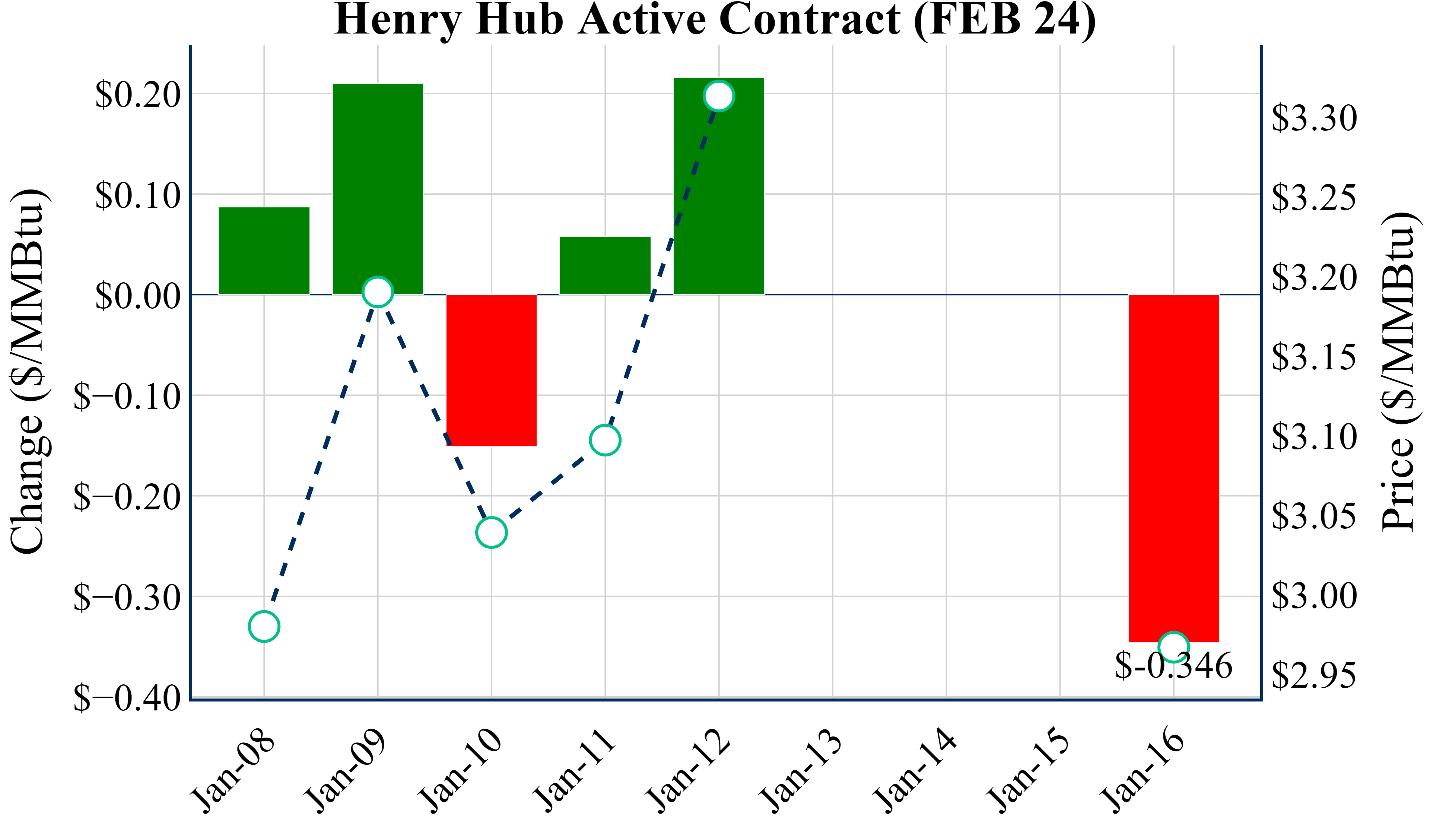 February ’24 Henry Hub is down 34.3c this morning to trade around $2.97/MMBtu